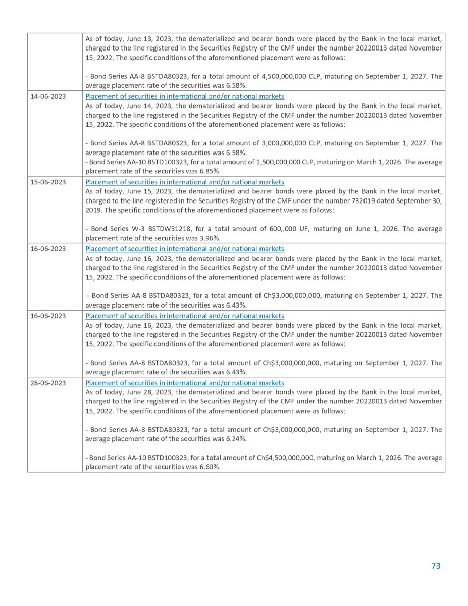 73 As of today, June 13 , 2023 , the dematerialized and bearer bonds were placed by the Bank in the local market, charged to the line registered in the Securities Registry of the CMF under the number 20220013 dated November 15 , 2022 . The specific conditions of the aforementioned placement were as follows : - Bond Series AA - 8 BSTDA 80323 , for a total amount of 4 , 500 , 000 , 000 CLP, maturing on September 1 , 2027 . The average placement rate of the securities was 6 . 58 % . Placement of securities in international and/or national markets As of today, June 14 , 2023 , the dematerialized and bearer bonds were placed by the Bank in the local market, charged to the line registered in the Securities Registry of the CMF under the number 20220013 dated November 15 , 2022 . The specific conditions of the aforementioned placement were as follows : - Bond Series AA - 8 BSTDA 80323 , for a total amount of 3 , 000 , 000 , 000 CLP, maturing on September 1 , 2027 . The average placement rate of the securities was 6 . 58 % . - Bond Series AA - 10 BSTD 100323 , for a total amount of 1 , 500 , 000 , 000 CLP, maturing on March 1 , 2026 . The average placement rate of the securities was 6 . 85 % . 14 - 06 - 2023 Placement of securities in international and/or national markets As of today, June 15, 2023, the dematerialized and bearer bonds were placed by the Bank in the local market, charged to the line registered in the Securities Registry of the CMF under the number 732019 dated September 30, 2019. The specific conditions of the aforementioned placement were as follows: - Bond Series W - 3 BSTDW31218, for a total amount of 600,.000 UF, maturing on June 1, 2026. The average placement rate of the securities was 3.96%. 15 - 06 - 2023 Placement of securities in international and/or national markets As of today, June 16 , 2023 , the dematerialized and bearer bonds were placed by the Bank in the local market, charged to the line registered in the Securities Registry of the CMF under the number 20220013 dated November 15 , 2022 . The specific conditions of the aforementioned placement were as follows : - Bond Series AA - 8 BSTDA 80323 , for a total amount of Ch $ 3 , 000 , 000 , 000 , maturing on September 1 , 2027 . The average placement rate of the securities was 6 . 43 % . 16 - 06 - 2023 Placement of securities in international and/or national markets As of today, June 16 , 2023 , the dematerialized and bearer bonds were placed by the Bank in the local market, charged to the line registered in the Securities Registry of the CMF under the number 20220013 dated November 15 , 2022 . The specific conditions of the aforementioned placement were as follows : - Bond Series AA - 8 BSTDA 80323 , for a total amount of Ch $ 3 , 000 , 000 , 000 , maturing on September 1 , 2027 . The average placement rate of the securities was 6 . 43 % . 16 - 06 - 2023 Placement of securities in international and/or national markets As of today, June 28 , 2023 , the dematerialized and bearer bonds were placed by the Bank in the local market, charged to the line registered in the Securities Registry of the CMF under the number 20220013 dated November 15 , 2022 . The specific conditions of the aforementioned placement were as follows : - Bond Series AA - 8 BSTDA 80323 , for a total amount of Ch $ 3 , 000 , 000 , 000 , maturing on September 1 , 2027 . The average placement rate of the securities was 6 . 24 % . - Bond Series AA - 10 BSTD 100323 , for a total amount of Ch $ 4 , 500 , 000 , 000 , maturing on March 1 , 2026 . The average placement rate of the securities was 6 . 60 % . 28 - 06 - 2023