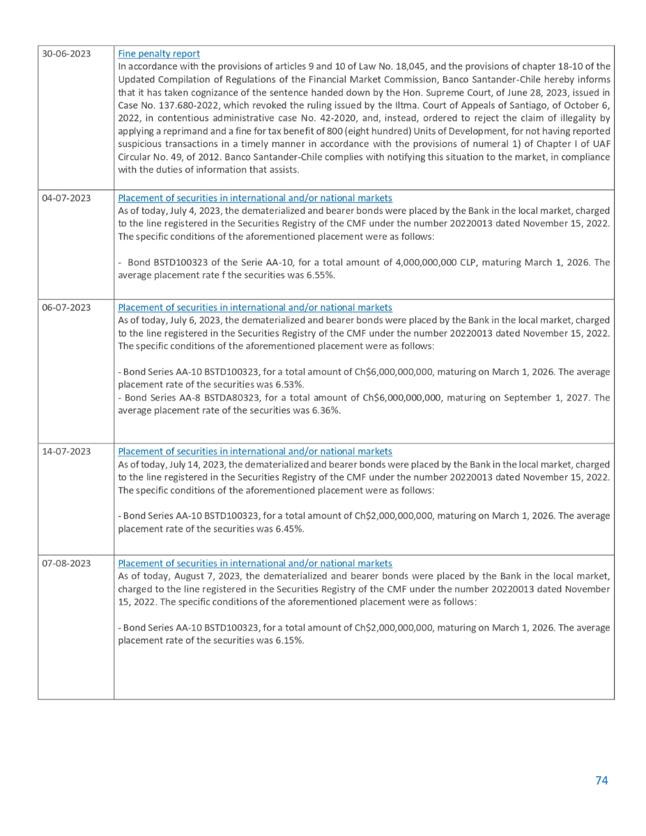 74 Fine penalty report In accordance with the provisions of articles 9 and 10 of Law No . 18 , 045 , and the provisions of chapter 18 - 10 of the Updated Compilation of Regulations of the Financial Market Commission, Banco Santander - Chile hereby informs that it has taken cognizance of the sentence handed down by the Hon . Supreme Court, of June 28 , 2023 , issued in Case No . 137 . 680 - 2022 , which revoked the ruling issued by the Iltma . Court of Appeals of Santiago, of October 6 , 2022 , in contentious administrative case No . 42 - 2020 , and, instead, ordered to reject the claim of illegality by applying a reprimand and a fine for tax benefit of 800 (eight hundred) Units of Development, for not having reported suspicious transactions in a timely manner in accordance with the provisions of numeral 1 ) of Chapter I of UAF Circular No . 49 , of 2012 . Banco Santander - Chile complies with notifying this situation to the market, in compliance with the duties of information that assists . 30 - 06 - 2023 Placement of securities in international and/or national markets As of today, July 4 , 2023 , the dematerialized and bearer bonds were placed by the Bank in the local market, charged to the line registered in the Securities Registry of the CMF under the number 20220013 dated November 15 , 2022 . The specific conditions of the aforementioned placement were as follows : - Bond BSTD 100323 of the Serie AA - 10 , for a total amount of 4 , 000 , 000 , 000 CLP, maturing March 1 , 2026 . The average placement rate f the securities was 6 . 55 % . 04 - 07 - 2023 Placement of securities in international and/or national markets As of today, July 6 , 2023 , the dematerialized and bearer bonds were placed by the Bank in the local market, charged to the line registered in the Securities Registry of the CMF under the number 20220013 dated November 15 , 2022 . The specific conditions of the aforementioned placement were as follows : - Bond Series AA - 10 BSTD 100323 , for a total amount of Ch $ 6 , 000 , 000 , 000 , maturing on March 1 , 2026 . The average placement rate of the securities was 6 . 53 % . - Bond Series AA - 8 BSTDA 80323 , for a total amount of Ch $ 6 , 000 , 000 , 000 , maturing on September 1 , 2027 . The average placement rate of the securities was 6 . 36 % . 06 - 07 - 2023 Placement of securities in international and/or national markets As of today, July 14 , 2023 , the dematerialized and bearer bonds were placed by the Bank in the local market, charged to the line registered in the Securities Registry of the CMF under the number 20220013 dated November 15 , 2022 . The specific conditions of the aforementioned placement were as follows : - Bond Series AA - 10 BSTD 100323 , for a total amount of Ch $ 2 , 000 , 000 , 000 , maturing on March 1 , 2026 . The average placement rate of the securities was 6 . 45 % . 14 - 07 - 2023 Placement of securities in international and/or national markets As of today, August 7 , 2023 , the dematerialized and bearer bonds were placed by the Bank in the local market, charged to the line registered in the Securities Registry of the CMF under the number 20220013 dated November 15 , 2022 . The specific conditions of the aforementioned placement were as follows : - Bond Series AA - 10 BSTD 100323 , for a total amount of Ch $ 2 , 000 , 000 , 000 , maturing on March 1 , 2026 . The average placement rate of the securities was 6 . 15 % . 07 - 08 - 2023