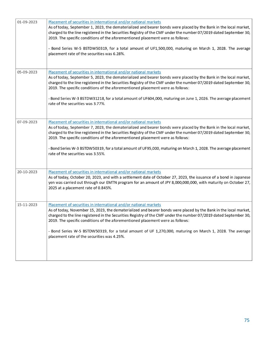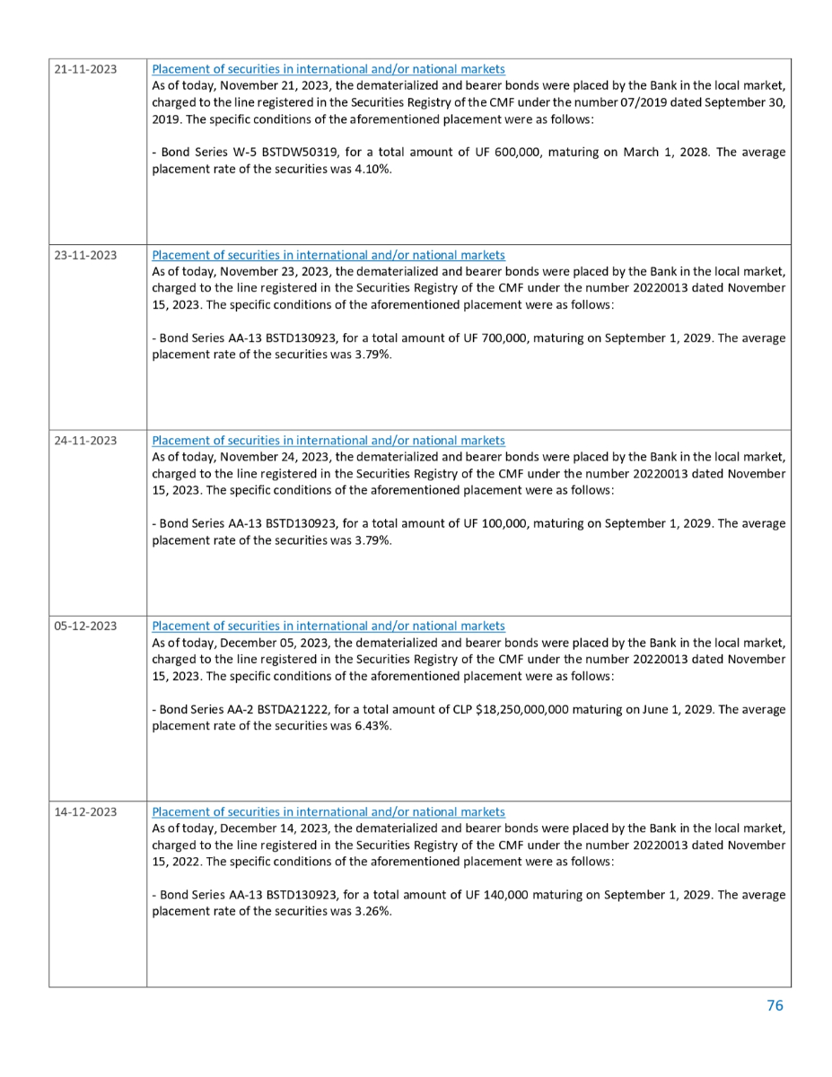 75 Placement of securities in international and/or national markets As of today, September 1, 2023, the dematerialized and bearer bonds were placed by the Bank in the local market, charged to the line registered in the Securities Registry of the CMF under the number 07/2019 dated September 30, 2019. The specific conditions of the aforementioned placement were as follows: - Bond Series W - 5 BSTDW50319, for a total amount of UF1,500,000, maturing on March 1, 2028. The average placement rate of the securities was 6.28%. 01 - 09 - 2023 Placement of securities in international and/or national markets As of today, September 5 , 2023 , the dematerialized and bearer bonds were placed by the Bank in the local market, charged to the line registered in the Securities Registry of the CMF under the number 07 / 2019 dated September 30 , 2019 . The specific conditions of the aforementioned placement were as follows : - Bond Series W - 3 BSTDW 31218 , for a total amount of UF 604 , 000 , maturing on June 1 , 2026 . The average placement rate of the securities was 3 . 77 % . 05 - 09 - 2023 Placement of securities in international and/or national markets As of today, September 7 , 2023 , the dematerialized and bearer bonds were placed by the Bank in the local market, charged to the line registered in the Securities Registry of the CMF under the number 07 / 2019 dated September 30 , 2019 . The specific conditions of the aforementioned placement were as follows : - Bond Series W - 3 BSTDW 50319 , for a total amount of UF 95 , 000 , maturing on March 1 , 2028 . The average placement rate of the securities wa s 3 . 55 % . 07 - 09 - 2023 Placement of securities in international and/or national markets As of today, October 20, 2023, and with a settlement date of October 27, 2023, the issuance of a bond in Japanese yen was carried out through our EMTN program for an amount of JPY 8,000,000,000, with maturity on October 27, 2025 at a placement rate of 0.845%. 20 - 10 - 2023 Placement of securities in international and/or national markets As of today, November 15 , 2023 , the dematerialized and bearer bonds were placed by the Bank in the local market, charged to the line registered in the Securities Registry of the CMF under the number 07 / 2019 dated September 30 , 2019 . The specific conditions of the aforementioned placement were as follows : - Bond Series W - 5 BSTDW 50319 , for a total amount of UF 1 , 270 , 000 , maturing on March 1 , 2028 . The average placement rate of the securities was 4 . 25 % . 15 - 11 - 2023