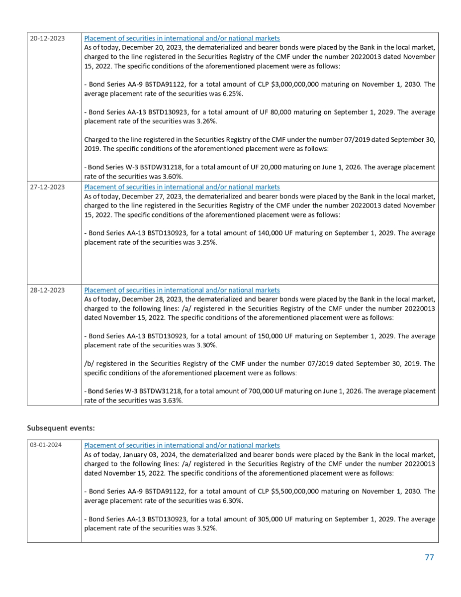 77 Placement of securities in international and/or national markets As of today, December 20, 2023, the dematerialized and bearer bonds were placed by the Bank in the local market, charged to the line registered in the Securities Registry of the CMF under the number 20220013 dated November 15, 2022. The specific conditions of the aforementioned placement were as follows: - Bond Series AA - 9 BSTDA91122, for a total amount of CLP $3,000,000,000 maturing on November 1, 2030. The average placement rate of the securities was 6.25%. - Bond Series AA - 13 BSTD130923, for a total amount of UF 80,000 maturing on September 1, 2029. The average placement rate of the securities was 3.26%. Charged to the line registered in the Securities Registry of the CMF under the number 07/2019 dated September 30, 2019. The specific conditions of the aforementioned placement were as follows: - Bond Series W - 3 BSTDW31218, for a total amount of UF 20,000 maturing on June 1, 2026. The average placement rate of the securities was 3.60%. 20 - 12 - 2023 Placement of securities in international and/or national markets As of today, December 27 , 2023 , the dematerialized and bearer bonds were placed by the Bank in the local market, charged to the line registered in the Securities Registry of the CMF under the number 20220013 dated November 15 , 2022 . The specific conditions of the aforementioned placement were as follows : - Bond Series AA - 13 BSTD 130923 , for a total amount of 140 , 000 UF maturing on September 1 , 2029 . The average placement rate of the securities was 3 . 25 % . 27 - 12 - 2023 Placement of securities in international and/or national markets As of today, December 28 , 2023 , the dematerialized and bearer bonds were placed by the Bank in the local market, charged to the following lines : /a/ registered in the Securities Registry of the CMF under the number 20220013 dated November 15 , 2022 . The specific conditions of the aforementioned placement were as follows : - Bond Series AA - 13 BSTD 130923 , for a total amount of 150 , 000 UF maturing on September 1 , 2029 . The average placement rate of the securities was 3 . 30 % . /b/ registered in the Securities Registry of the CMF under the number 07 / 2019 dated September 30 , 2019 . The specific conditions of the aforementioned placement were as follows : - Bond Series W - 3 BSTDW 31218 , for a total amount of 700 , 000 UF maturing on June 1 , 2026 . The average placement rate of the securities was 3 . 63 % . 28 - 12 - 2023 Subsequent events: Placement of securities in international and/or national markets As of today, January 03 , 2024 , the dematerialized and bearer bonds were placed by the Bank in the local market, charged to the following lines : /a/ registered in the Securities Registry of the CMF under the number 20220013 dated November 15 , 2022 . The specific conditions of the aforementioned placement were as follows : - Bond Series AA - 9 BSTDA 91122 , for a total amount of CLP $ 5 , 500 , 000 , 000 maturing on November 1 , 2030 . The average placement rate of the securities was 6 . 30 % . - Bond Series AA - 13 BSTD 130923 , for a total amount of 305 , 000 UF maturing on September 1 , 2029 . The average placement rate of the securities was 3 . 52 % . 03 - 01 - 2024