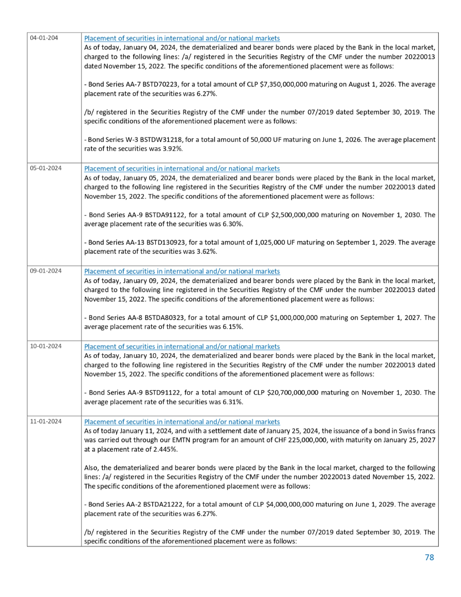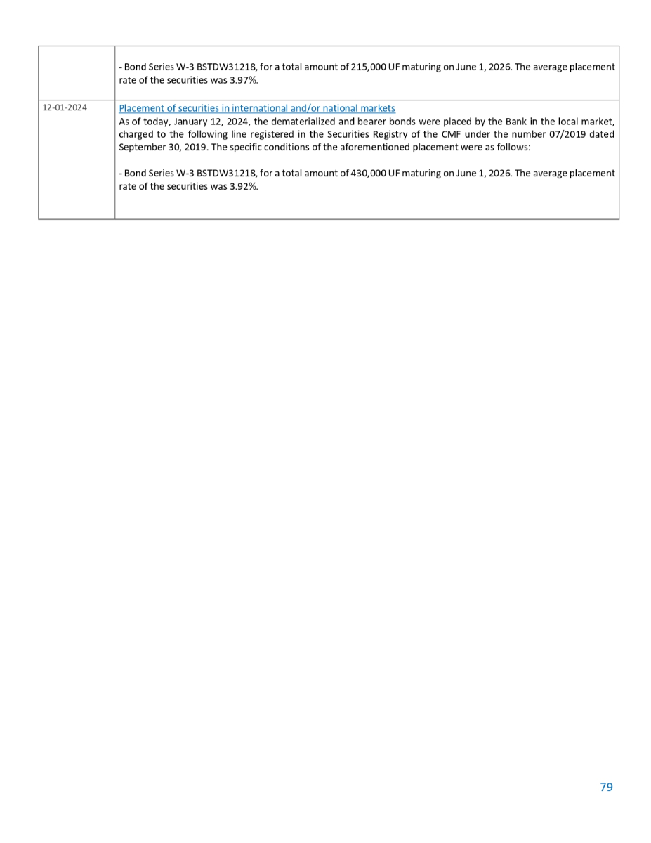 78 Placement of securities in international and/or national markets As of today, January 04, 2024, the dematerialized and bearer bonds were placed by the Bank in the local market, charged to the following lines: /a/ registered in the Securities Registry of the CMF under the number 20220013 dated November 15, 2022. The specific conditions of the aforementioned placement were as follows: - Bond Series AA - 7 BSTD70223, for a total amount of CLP $7,350,000,000 maturing on August 1, 2026. The average placement rate of the securities was 6.27%. /b/ registered in the Securities Registry of the CMF under the number 07/2019 dated September 30, 2019. The specific conditions of the aforementioned placement were as follows: - Bond Series W - 3 BSTDW31218, for a total amount of 50,000 UF maturing on June 1, 2026. The average placement rate of the securities was 3.92%. 04 - 01 - 204 Placement of securities in international and/or national markets As of today, January 05 , 2024 , the dematerialized and bearer bonds were placed by the Bank in the local market, charged to the following line registered in the Securities Registry of the CMF under the number 20220013 dated November 15 , 2022 . The specific conditions of the aforementioned placement were as follows : - Bond Series AA - 9 BSTDA 91122 , for a total amount of CLP $ 2 , 500 , 000 , 000 maturing on November 1 , 2030 . The average placement rate of the securities was 6 . 30 % . - Bond Series AA - 13 BSTD 130923 , for a total amount of 1 , 025 , 000 UF maturing on September 1 , 2029 . The average placement rate of the securities was 3 . 62 % . 05 - 01 - 2024 Placement of securities in international and/or national markets As of today, January 09 , 2024 , the dematerialized and bearer bonds were placed by the Bank in the local market, charged to the following line registered in the Securities Registry of the CMF under the number 20220013 dated November 15 , 2022 . The specific conditions of the aforementioned placement were as follows : - Bond Series AA - 8 BSTDA 80323 , for a total amount of CLP $ 1 , 000 , 000 , 000 maturing on September 1 , 2027 . The average placement rate of the securities was 6 . 15 % . 09 - 01 - 2024 Placement of securities in international and/or national markets As of today, January 10 , 2024 , the dematerialized and bearer bonds were placed by the Bank in the local market, charged to the following line registered in the Securities Registry of the CMF under the number 20220013 dated November 15 , 2022 . The specific conditions of the aforementioned placement were as follows : - Bond Series AA - 9 BSTD 91122 , for a total amount of CLP $ 20 , 700 , 000 , 000 maturing on November 1 , 2030 . The average placement rate of the securities was 6 . 31 % . 10 - 01 - 2024 Placement of securities in international and/or national markets As of today January 11 , 2024 , and with a settlement date of January 25 , 2024 , the issuance of a bond in Swiss francs was carried out through our EMTN program for an amount of CHF 225 , 000 , 000 , with maturity on January 25 , 2027 at a placement rate of 2 . 445 % . Also, the dematerialized and bearer bonds were placed by the Bank in the local market, charged to the following lines : /a/ registered in the Securities Registry of the CMF under the number 20220013 dated November 15 , 2022 . The specific conditions of the aforementioned placement were as follows : - Bond Series AA - 2 BSTDA 21222 , for a total amount of CLP $ 4 , 000 , 000 , 000 maturing on June 1 , 2029 . The average placement rate of the securities was 6 . 27 % . /b/ registered in the Securities Registry of the CMF under the number 07 / 2019 dated September 30 , 2019 . The specific conditions of the aforementioned placement were as follows : 11 - 01 - 2024