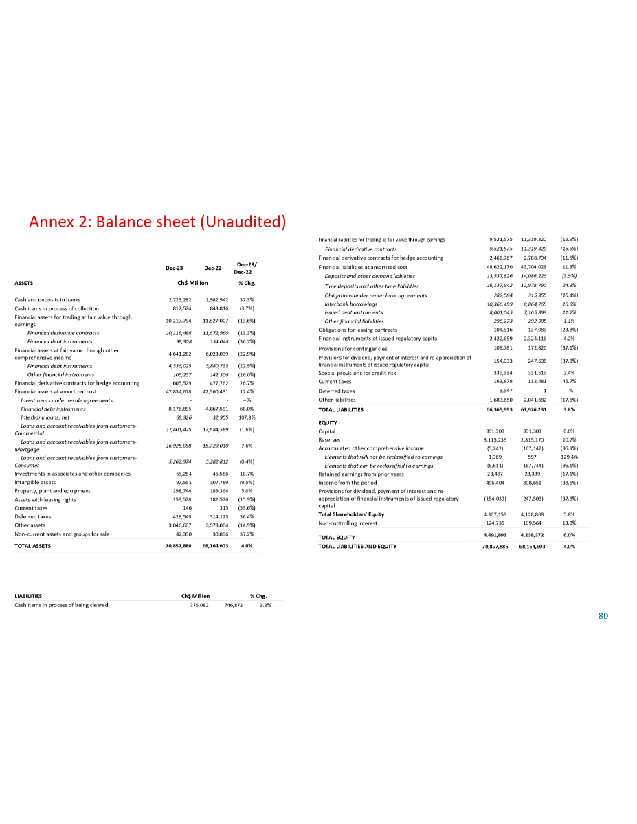 80 Annex 2: Balance sheet (Unaudited) Dec - 23/ Dec - 22 Dec - 22 Dec - 23 % Chg. Ch$ Million ASSETS 37.3% 1,982,942 2,723,282 Cash and deposits in banks (3.7%) 843,816 812,524 Cash items in process of collection (13.6%) 11,827,007 10,217,794 Financial assets for trading at fair value through earnings (13.3%) 11,672,960 10,119,486 Financial derivative contracts (36.2%) 154,046 98,308 Financial debt instruments (22.9%) 6,023,039 4,641,282 Financial assets at fair value through other comprehensive income (22.9%) 5,880,733 4,536,025 Financial debt instruments (26.0%) 142,306 105,257 Other financial instruments 26.7% 477,762 605,529 Financial derivative contracts for hedge accounting 12.4% 42,560,431 47,834,678 Financial assets at amortized cost -- % - - Investments under resale agreements 68.0% 4,867,591 8,176,895 Financial debt instruments 107.3% 32,955 68,326 Interbank loans, net (1.6%) 17,684,589 17,401,425 Loans and account receivables from customers - Commercial 7.6% 15,729,010 16,925,058 Loans and account receivables from customers - Mortgage (0.4%) 5,282,812 5,262,974 Loans and account receivables from customers - Consumer 18.7% 46,586 55,284 Investments in associates and other companies (9.5%) 107,789 97,551 Intangible assets 5.0% 189,364 198,744 Property, plant and equipment (15.9%) 182,526 153,528 Assets with leasing rights (53.6%) 315 146 Current taxes 36.4% 314,125 428,549 Deferred taxes (14.9%) 3,578,004 3,046,607 Other assets 37.2% 30,896 42,390 Non - current assets and groups for sale 4.0% 68,164,603 70,857,886 TOTAL ASSETS % Chg. Ch$ Million LIABILITIES 3.8% 746,872 775,082 Cash items in process of being cleared (15.9%) 11,319,320 9,521,575 Financial liabilities for trading at fair value through earnings (15.9%) 11,319,320 9,521,575 Financial derivative contracts (11.5%) 2,788,794 2,466,767 Financial derivative contracts for hedge accounting 11.3% 43,704,023 48,622,170 Financial liabilities at amortized cost (3.9%) 14,086,226 13,537,826 Deposits and other demand liabilities 24.3% 12,978,790 16,137,942 Time deposits and other time liabilities (10.4%) 315,355 282,584 Obligations under repurchase agreements 16.9% 8,864,765 10,366,499 Interbank borrowings 11.7% 7,165,893 8,001,045 Issued debt instruments 1.1% 292,995 296,273 Other financial liabilities (23.8%) 137,089 104,516 Obligations for leasing contracts 4.2% 2,324,116 2,422,659 Financial instruments of issued regulatory capital (37.1%) 172,826 108,781 Provisions for contingencies (37.8%) 247,508 154,033 Provisions for dividend, payment of interest and re - appreciation of financial instruments of issued regulatory capital 2.4% 331,519 339,334 Special provisions for credit risk 45.7% 112,481 163,878 Current taxes -- % 1 3,547 Deferred taxes (17.5%) 2,041,682 1,683,650 Other liabilities 3.8% 63,926,231 66,365,993 TOTAL LIABILITIES EQUITY 0.0% 891,303 891,303 Capital 10.7% 2,815,170 3,115,239 Reserves (96.9%) (167,147) (5,242) Accumulated other comprehensive income 129.4% 597 1,369 Elements that will not be reclassified to earnings (96.1%) (167,744) (6,611) Elements that can be reclassified to earnings (17.1%) 28,339 23,487 Retained earnings from prior years (38.6%) 808,651 496,404 Income from the period (37.8%) (247,508) (154,033) Provisions for dividend, payment of interest and re - appreciation of financial instruments of issued regulatory capital 5.8% 4,128,808 4,367,159 Total Shareholders' Equity 13.8% 109,564 124,735 Non - controlling interest 6.0% 4,238,372 4,491,893 TOTAL EQUITY 4.0% 68,164,603 70,857,886 TOTAL LIABILITIES AND EQUITY