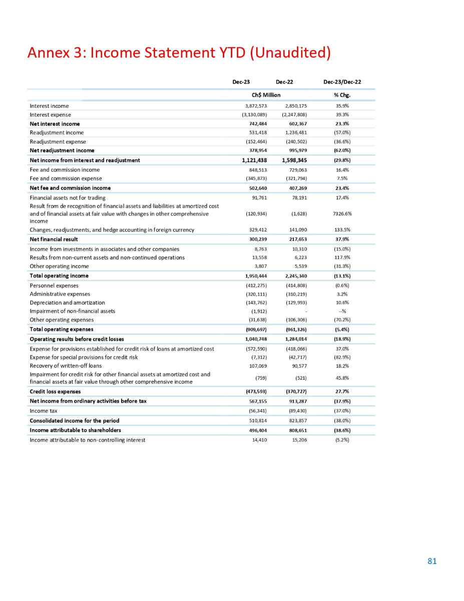 81 Annex 3: Income Statement YTD (Unaudited) Dec - 23/Dec - 22 Dec - 22 Dec - 23 % Chg. Ch$ Million 35.9% 2,850,175 3,872,573 Interest income 39.3% (2,247,808) (3,130,089) Interest expense 23.3% 602,367 742,484 Net interest income (57.0%) 1,236,481 531,418 Readjustment income (36.6%) (240,502) (152,464) Readjustment expense (62.0%) 995,979 378,954 Net readjustment income (29.8%) 1,598,345 1,121,438 Net income from interest and readjustment 16.4% 729,063 848,513 Fee and commission income 7.5% (321,794) (345,873) Fee and commission expense 23.4% 407,269 502,640 Net fee and commission income 17.4% 78,191 91,761 Financial assets not for trading 7326.6% (1,628) (120,934) Result from de recognition of financial assets and liabilities at amortized cost and of financial assets at fair value with changes in other comprehensive income 133.5% 141,090 329,412 Changes, readjustments, and hedge accounting in foreign currency 37.9% 217,653 300,239 Net financial result (15.0%) 10,310 8,763 Income from investments in associates and other companies 117.9% 6,223 13,558 Results from non - current assets and non - continued operations (31.3%) 5,539 3,807 Other operating income (13.1%) 2,245,340 1,950,444 Total operating income (0.6%) (414,808) (412,275) Personnel expenses 3.2% (310,219) (320,111) Administrative expenses 10.6% (129,993) (143,762) Depreciation and amortization -- % - (1,912) Impairment of non - financial assets (70.2%) (106,306) (31,638) Other operating expenses (5.4%) (961,326) (909,697) Total operating expenses (18.9%) 1,284,014 1,040,748 Operating results before credit losses 37.0% (418,066) (572,590) Expense for provisions established for credit risk of loans at amortized cost (82.9%) (42,717) (7,312) Expense for special provisions for credit risk 18.2% 90,577 107,069 Recovery of written - off loans 45.8% (521) (759) Impairment for credit risk for other financial assets at amortized cost and financial assets at fair value through other comprehensive income 27.7% (370,727) (473,593) Credit loss expenses (37.9%) 913,287 567,155 Net income from ordinary activities before tax (37.0%) (89,430) (56,341) Income tax (38.0%) 823,857 510,814 Consolidated income for the period (38.6%) 808,651 496,404 Income attributable to shareholders (5.2%) 15,206 14,410 Income attributable to non - controlling interest