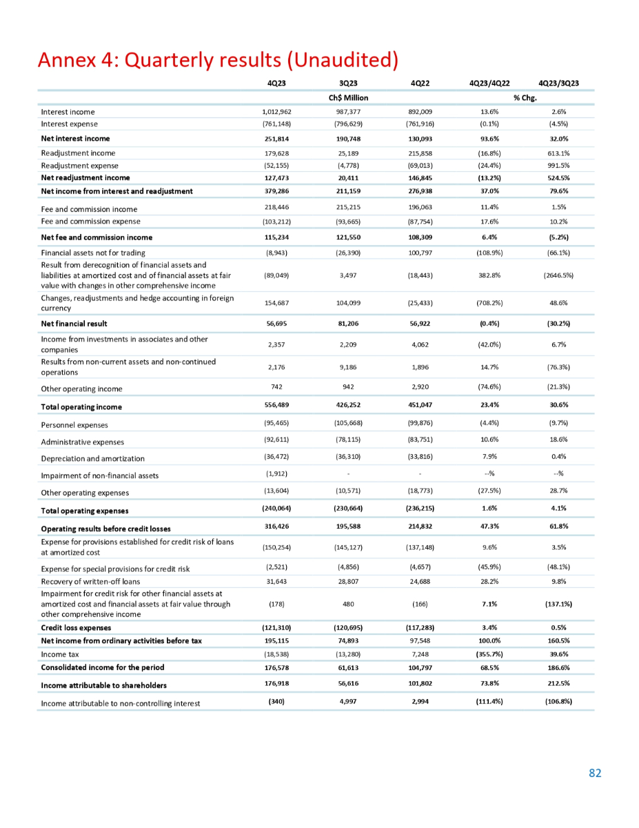 82 Annex 4: Quarterly results (Unaudited) 4Q23/3Q23 4Q23/4Q22 4Q22 3Q23 4Q23 % Chg. Ch$ Million 2.6% 13.6% 892,009 987,377 1,012,962 Interest income (4.5%) (0.1%) (761,916) (796,629) (761,148) Interest expense 32.0% 93.6% 130,093 190,748 251,814 Net interest income 613.1% (16.8%) 215,858 25,189 179,628 Readjustment income 991.5% (24.4%) (69,013) (4,778) (52,155) Readjustment expense 524.5% (13.2%) 146,845 20,411 127,473 Net readjustment income 79.6% 37.0% 276,938 211,159 379,286 Net income from interest and readjustment 1.5% 11.4% 196,063 215,215 218,446 Fee and commission income 10.2% 17.6% (87,754) (93,665) (103,212) Fee and commission expense (5.2%) 6.4% 108,309 121,550 115,234 Net fee and commission income (66.1%) (108.9%) 100,797 (26,390) (8,943) Financial assets not for trading (2646.5%) 382.8% (18,443) 3,497 (89,049) Result from derecognition of financial assets and liabilities at amortized cost and of financial assets at fair value with changes in other comprehensive income 48.6% (708.2%) (25,433) 104,099 154,687 Changes, readjustments and hedge accounting in foreign currency (30.2%) (0.4%) 56,922 81,206 56,695 Net financial result 6.7% (42.0%) 4,062 2,209 2,357 Income from investments in associates and other companies (76.3%) 14.7% 1,896 9,186 2,176 Results from non - current assets and non - continued operations (21.3%) (74.6%) 2,920 942 742 Other operating income 30.6% 23.4% 451,047 426,252 556,489 Total operating income (9.7%) (4.4%) (99,876) (105,668) (95,465) Personnel expenses 18.6% 10.6% (83,751) (78,115) (92,611) Administrative expenses 0.4% 7.9% (33,816) (36,310) (36,472) Depreciation and amortization -- % -- % - - (1,912) Impairment of non - financial assets 28.7% (27.5%) (18,773) (10,571) (13,604) Other operating expenses 4.1% 1.6% (236,215) (230,664) (240,064) Total operating expenses 61.8% 47.3% 214,832 195,588 316,426 Operating results before credit losses 3.5% 9.6% (137,148) (145,127) (150,254) Expense for provisions established for credit risk of loans at amortized cost (48.1%) (45.9%) (4,657) (4,856) (2,521) Expense for special provisions for credit risk 9.8% 28.2% 24,688 28,807 31,643 Recovery of written - off loans (137.1%) 7.1% (166) 480 (178) Impairment for credit risk for other financial assets at amortized cost and financial assets at fair value through other comprehensive income 0.5% 3.4% (117,283) (120,695) (121,310) Credit loss expenses 160.5% 100.0% 97,548 74,893 195,115 Net income from ordinary activities before tax 39.6% (355.7%) 7,248 (13,280) (18,538) Income tax 186.6% 68.5% 104,797 61,613 176,578 Consolidated income for the period 212.5% 73.8% 101,802 56,616 176,918 Income attributable to shareholders (106.8%) (111.4%) 2,994 4,997 (340) Income attributable to non - controlling interest