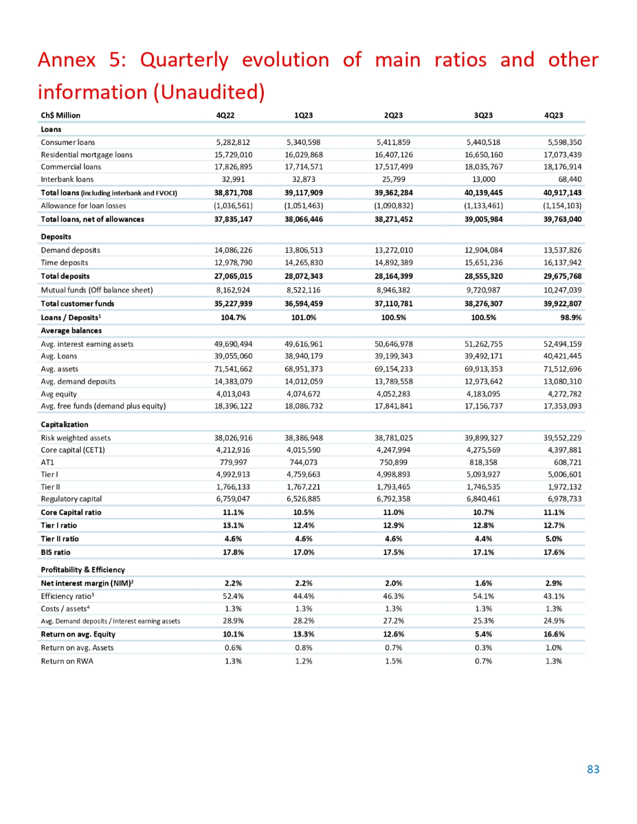 83 Annex 5: Quarterly evolution of main ratios and other information (Unaudited) 4Q23 3Q23 2Q23 1Q23 4Q22 Ch$ Million Loans 5,598,350 5,440,518 5,411,859 5,340,598 5,282,812 Consumer loans 17,073,439 16,650,160 16,407,126 16,029,868 15,729,010 Residential mortgage loans 18,176,914 18,035,767 17,517,499 17,714,571 17,826,895 Commercial loans 68,440 13,000 25,799 32,873 32,991 Interbank loans 40,917,143 40,139,445 39,362,284 39,117,909 38,871,708 Total loans (including interbank and FVOCI) (1,154,103) (1,133,461) (1,090,832) (1,051,463) (1,036,561) Allowance for loan losses 39,763,040 39,005,984 38,271,452 38,066,446 37,835,147 Total loans, net of allowances Deposits 13,537,826 12,904,084 13,272,010 13,806,513 14,086,226 Demand deposits 16,137,942 15,651,236 14,892,389 14,265,830 12,978,790 Time deposits 29,675,768 28,555,320 28,164,399 28,072,343 27,065,015 Total deposits 10,247,039 9,720,987 8,946,382 8,522,116 8,162,924 Mutual funds (Off balance sheet) 39,922,807 38,276,307 37,110,781 36,594,459 35,227,939 Total customer funds 98.9% 100.5% 100.5% 101.0% 104.7% Loans / Deposits 1 Average balances 52,494,159 51,262,755 50,646,978 49,616,961 49,690,494 Avg. interest earning assets 40,421,445 39,492,171 39,199,343 38,940,179 39,055,060 Avg. Loans 71,512,696 69,913,353 69,154,233 68,951,373 71,541,662 Avg. assets 13,080,310 12,973,642 13,789,558 14,012,059 14,383,079 Avg. demand deposits 4,272,782 4,183,095 4,052,283 4,074,672 4,013,043 Avg equity 17,353,093 17,156,737 17,841,841 18,086,732 18,396,122 Avg. free funds (demand plus equity) Capitalization 39,552,229 39,899,327 38,781,025 38,386,948 38,026,916 Risk weighted assets 4,397,881 4,275,569 4,247,994 4,015,590 4,212,916 Core capital (CET1) 608,721 818,358 750,899 744,073 779,997 AT1 5,006,601 5,093,927 4,998,893 4,759,663 4,992,913 Tier I 1,972,132 1,746,535 1,793,465 1,767,221 1,766,133 Tier II 6,978,733 6,840,461 6,792,358 6,526,885 6,759,047 Regulatory capital 11.1% 10.7% 11.0% 10.5% 11.1% Core Capital ratio 12.7% 12.8% 12.9% 12.4% 13.1% Tier I ratio 5.0% 4.4% 4.6% 4.6% 4.6% Tier II ratio 17.6% 17.1% 17.5% 17.0% 17.8% BIS ratio Profitability & Efficiency 2.9% 1.6% 2.0% 2.2% 2.2% Net interest margin (NIM) 2 43.1% 54.1% 46.3% 44.4% 52.4% Efficiency ratio 3 1.3% 1.3% 1.3% 1.3% 1.3% Costs / assets 4 24.9% 25.3% 27.2% 28.2% 28.9% Avg. Demand deposits / interest earning assets 16.6% 5.4% 12.6% 13.3% 10.1% Return on avg. Equity 1.0% 0.3% 0.7% 0.8% 0.6% Return on avg. Assets 1.3% 0.7% 1.5% 1.2% 1.3% Return on RWA