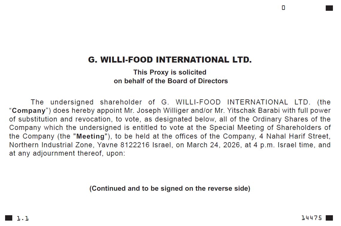0  14475  G. WILLI-FOOD INTERNATIONAL LTD.  This Proxy is solicited  on behalf of the Board of Directors  The undersigned shareholder of G. WILLI-FOOD INTERNATIONAL LTD. (the “Company”) does hereby appoint Mr. Joseph Williger and/or Mr. Yitschak Barabi with full power of substitution and revocation, to vote, as designated below, all of the Ordinary Shares of the Company which the undersigned is entitled to vote at the Special Meeting of Shareholders of the Company (the "Meeting"), to be held at the offices of the Company, 4 Nahal Harif Street, Northern Industrial Zone, Yavne 8122216 Israel, on March 24, 2026, at 4 p.m. Israel time, and at any adjournment thereof, upon:  (Continued and to be signed on the reverse side)  1.1