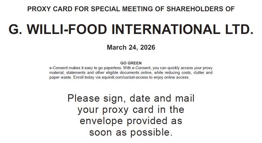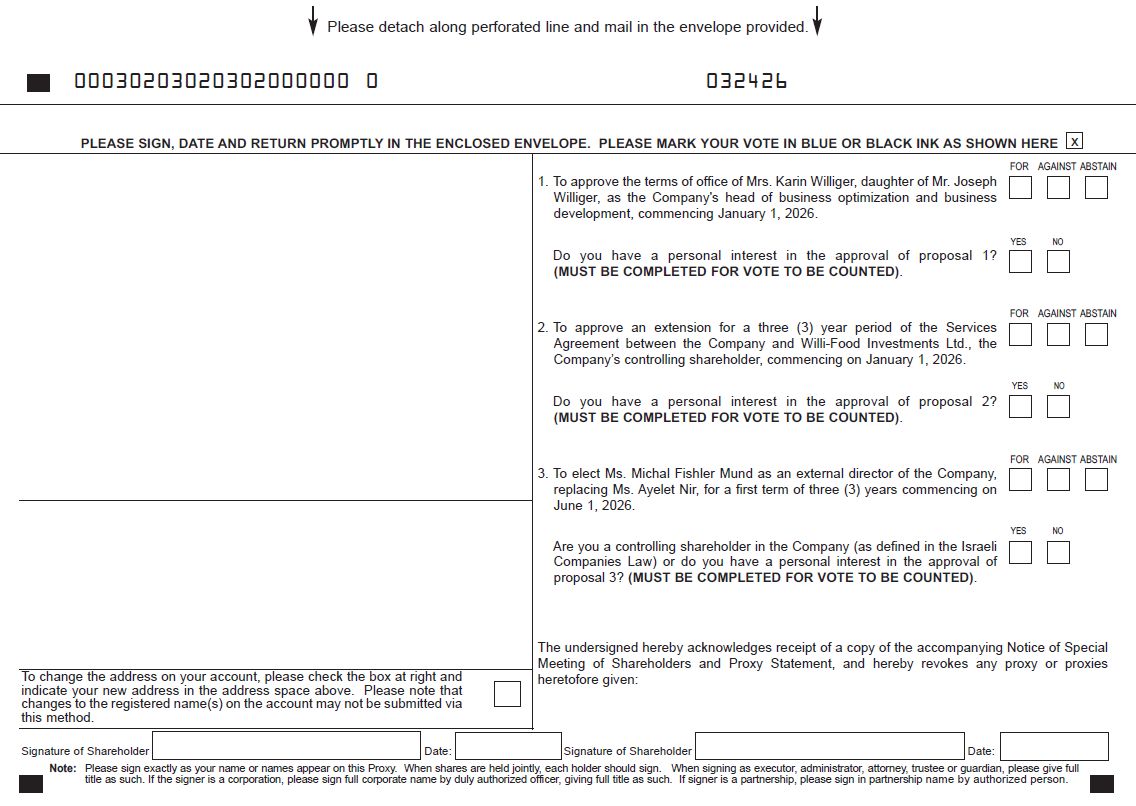 PROXY CARD FOR SPECIAL MEETING OF SHAREHOLDERS OF  G. WILLI-FOOD INTERNATIONAL LTD.  March 24, 2026  Please sign, date and mail your proxy card in the  envelope provided as soon as possible.  Signature of Shareholder Date:  Note: Please sign exactly as your name or names appear on this Proxy. When shares are held jointly, each holder should sign. When signing as executor, administrator, attorney, trustee or guardian, please give full title as such. If the signer is a corporation, please sign full corporate name by duly authorized officer, giving full title as such. If signer is a partnership, please sign in partnership name by authorized person.  To change the address on your account, please check the box at right and indicate your new address in the address space above. Please note that changes to the registered name(s) on the account may not be submitted via this method.  Signature of Shareholder Date:  Are you a controlling shareholder in the Company (as defined in the Israeli Companies Law) or do you have a personal interest in the approval of proposal 3? (MUST BE COMPLETED FOR VOTE TO BE COUNTED).  The undersigned hereby acknowledges receipt of a copy of the accompanying Notice of Special Meeting of Shareholders and Proxy Statement, and hereby revokes any proxy or proxies heretofore given:  PLEASE SIGN, DATE AND RETURN PROMPTLY IN THE ENCLOSED ENVELOPE. PLEASE MARK YOUR VOTE IN BLUE OR BLACK INK AS SHOWN HERE x  Please detach along perforated line and mail in the envelope provided.  00030203020302000000 0 032426  GO GREEN  e-Consent makes it easy to go paperless. With e-Consent, you can quickly access your proxy material, statements and other eligible documents online, while reducing costs, clutter and paper waste. Enroll today via equiniti.com/us/ast-access to enjoy online access.  YES  NO  YES  NO  FOR AGAINST ABSTAIN  1. To approve the terms of office of Mrs. Karin Williger, daughter of Mr. Joseph Williger, as the Company's head of business optimization and business development, commencing January 1, 2026.  Do you have a personal interest in the approval of proposal 1?  (MUST BE COMPLETED FOR VOTE TO BE COUNTED).  FOR AGAINST ABSTAIN  2. To approve an extension for a three (3) year period of the Services Agreement between the Company and Willi-Food Investments Ltd., the Company’s controlling shareholder, commencing on January 1, 2026.  Do you have a personal interest in the approval of proposal 2?  (MUST BE COMPLETED FOR VOTE TO BE COUNTED).  FOR AGAINST ABSTAIN  3. To elect Ms. Michal Fishler Mund as an external director of the Company, replacing Ms. Ayelet Nir, for a first term of three (3) years commencing on June 1, 2026.  YES  NO
