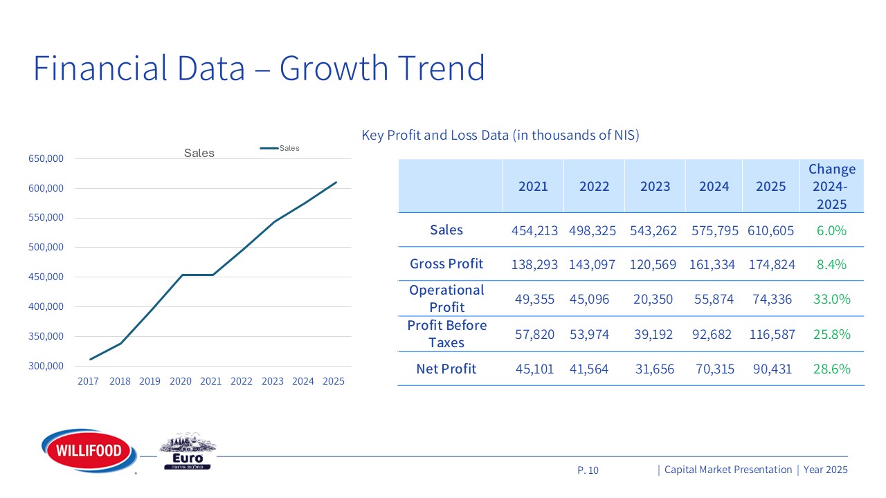 Year 2025 | Capital Market Presentation |   P. 10  Financial Data – Growth Trend  Key Profit and Loss Data (in thousands of NIS)  Change   2024-2025  2025  2024  2023  2022  2021  6.0%  610,605  575,795    543,262    498,325   454,213   Sales  8.4%  174,824    161,334    120,569    143,097   138,293   Gross Profit  33.0%  74,336   55,874  20,350    45,096   49,355   Operational Profit  25.8%  116,587   92,682   39,192    53,974   57,820   Profit Before Taxes  28.6%  90,431   70,315   31,656   41,564   45,101   Net Profit