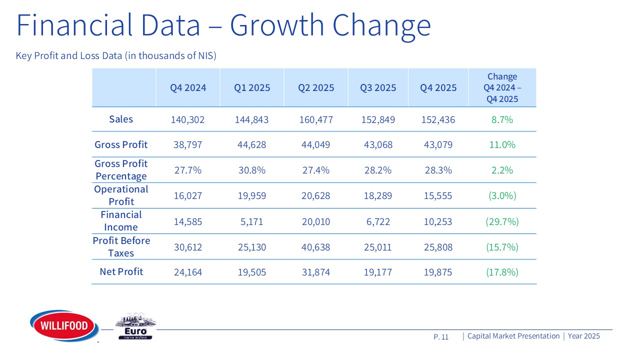P. 11  Financial Data – Growth Change  Key Profit and Loss Data (in thousands of NIS)  Change  Q4 2024 –   Q4 2025  Q4 2025  Q3 2025  Q2 2025  Q1 2025  Q4 2024  8.7%  152,436  152,849  160,477  144,843  140,302  Sales  11.0%  43,079  43,068  44,049  44,628  38,797  Gross Profit  2.2%  28.3%  28.2%  27.4%  30.8%  27.7%  Gross Profit Percentage  (3.0%)  15,555  18,289  20,628  19,959  16,027  Operational Profit  (29.7%)  10,253  6,722  20,010  5,171  14,585  Financial Income  (15.7%)  25,808  25,011  40,638  25,130  30,612  Profit Before Taxes  (17.8%)  19,875  19,177  31,874  19,505  24,164  Net Profit  Year 2025 | Capital Market Presentation |