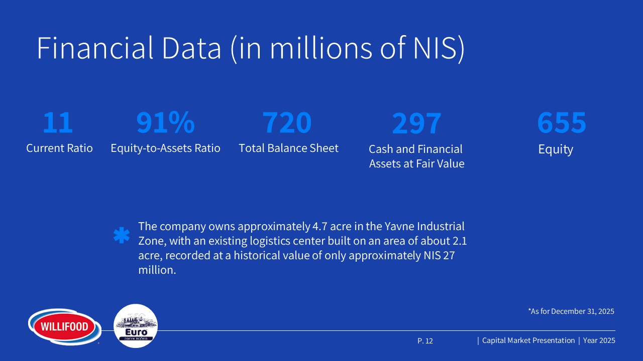 Year 2025 | Capital Market Presentation |   P. 12  Financial Data (in millions of NIS)  11   Current Ratio  91%  Equity-to-Assets Ratio  720   Total Balance Sheet  297  Cash and Financial   Assets at Fair Value  655   Equity  The company owns approximately 4.7 acre in the Yavne Industrial Zone, with an existing logistics center built on an area of about 2.1 acre, recorded at a historical value of only approximately NIS 27 million.  *As for December 31, 2025