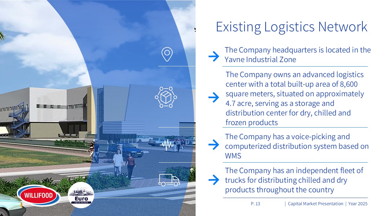 Year 2025 | Capital Market Presentation |   P. 13  Existing Logistics Network  The Company headquarters is located in the Yavne Industrial Zone  The Company owns an advanced logistics center with a total built-up area of 8,600 square meters, situated on approximately 4.7 acre, serving as a storage and distribution center for dry, chilled and frozen products  The Company has a voice-picking and computerized distribution system based on WMS  The Company has an independent fleet of trucks for distributing chilled and dry products throughout the country
