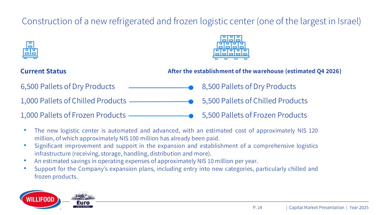 Year 2025 | Capital Market Presentation |   P. 14  Construction of a new refrigerated and frozen logistic center (one of the largest in Israel)  Current Status  6,500 Pallets of Dry Products  1,000 Pallets of Chilled Products  1,000 Pallets of Frozen Products  After the establishment of the warehouse (estimated Q4 2026)  8,500 Pallets of Dry Products  5,500 Pallets of Chilled Products  5,500 Pallets of Frozen Products  The new logistic center is automated and advanced, with an estimated cost of approximately NIS 120 million, of which approximately NIS 100 million has already been paid.  Significant improvement and support in the expansion and establishment of a comprehensive logistics infrastructure (receiving, storage, handling, distribution and more).  An estimated savings in operating expenses of approximately NIS 10 million per year.  Support for the Company’s expansion plans, including entry into new categories, particularly chilled and frozen products.