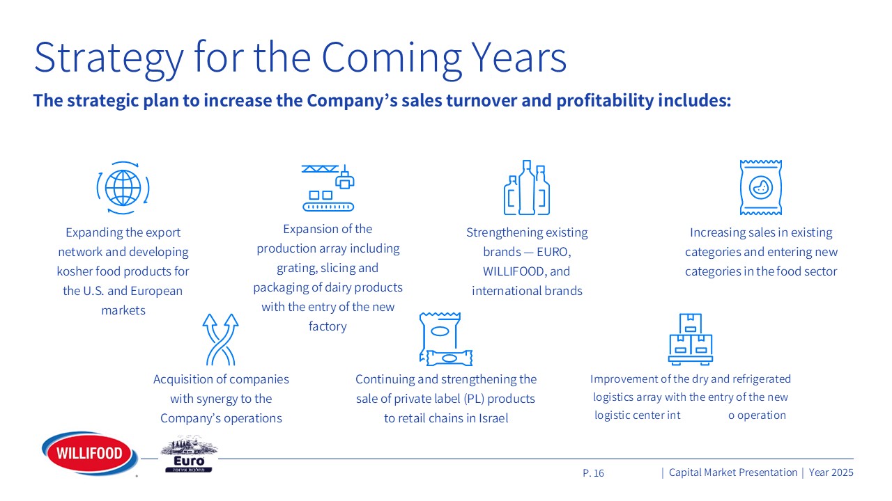 Year 2025 | Capital Market Presentation |   P. 16  Strategy for the Coming Years  The strategic plan to increase the Company’s sales turnover and profitability includes:  Expanding the export network and developing kosher food products for the U.S. and European markets  Expansion of the production array including grating, slicing and packaging of dairy products with the entry of the new factory  Strengthening existing brands — EURO, WILLIFOOD, and international brands  Increasing sales in existing categories and entering new categories in the food sector  Acquisition of companies with synergy to the Company’s operations  Continuing and strengthening the sale of private label (PL) products to retail chains in Israel  Improvement of the dry and refrigerated logistics array with the entry of the new logistic center int o operation