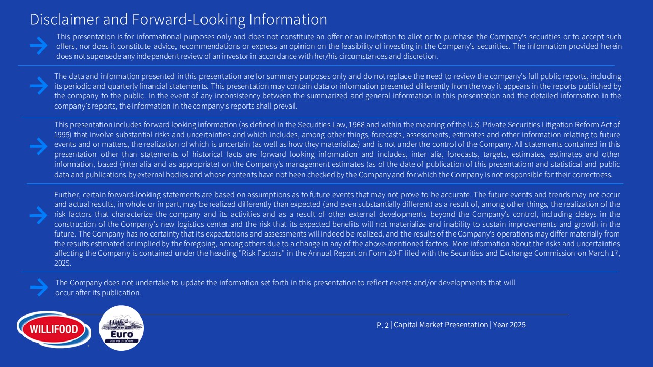 | Capital Market Presentation | Year 2025      P. 2  Disclaimer and Forward-Looking Information  This presentation is for informational purposes only and does not constitute an offer or an invitation to allot or to purchase the Company's securities or to accept such offers, nor does it constitute advice, recommendations or express an opinion on the feasibility of investing in the Company's securities. The information provided herein does not supersede any independent review of an investor in accordance with her/his circumstances and discretion.  The data and information presented in this presentation are for summary purposes only and do not replace the need to review the company’s full public reports, including its periodic and quarterly financial statements. This presentation may contain data or information presented differently from the way it appears in the reports published by the company to the public. In the event of any inconsistency between the summarized and general information in this presentation and the detailed information in the company’s reports, the information in the company’s reports shall prevail.  This presentation includes forward looking information (as defined in the Securities Law, 1968 and within the meaning of the U.S. Private Securities Litigation Reform Act of 1995) that involve substantial risks and uncertainties and which includes, among other things, forecasts, assessments, estimates and other information relating to future events and or matters, the realization of which is uncertain (as well as how they materialize) and is not under the control of the Company. All statements contained in this presentation other than statements of historical facts are forward looking information and includes, inter alia, forecasts, targets, estimates, estimates and other information, based (inter alia and as appropriate) on the Company's management estimates (as of the date of publication of this presentation) and statistical and public data and publications by external bodies and whose contents have not been checked by the Company and for which the Company is not responsible for their correctness.  Further, certain forward-looking statements are based on assumptions as to future events that may not prove to be accurate. The future events and trends may not occur and actual results, in whole or in part, may be realized differently than expected (and even substantially different) as a result of, among other things, the realization of the risk factors that characterize the company and its activities and as a result of other external developments beyond the Company's control, including delays in the construction of the Company’s new logistics center and the risk that its expected benefits will not materialize and inability to sustain improvements and growth in the future. The Company has no certainty that its expectations and assessments will indeed be realized, and the results of the Company's operations may differ materially from the results estimated or implied by the foregoing, among others due to a change in any of the above-mentioned factors. More information about the risks and uncertainties affecting the Company is contained under the heading "Risk Factors" in the Annual Report on Form 20-F filed with the Securities and Exchange Commission on March 17, 2025.   The Company does not undertake to update the information set forth in this presentation to reflect events and/or developments that will occur after its publication.