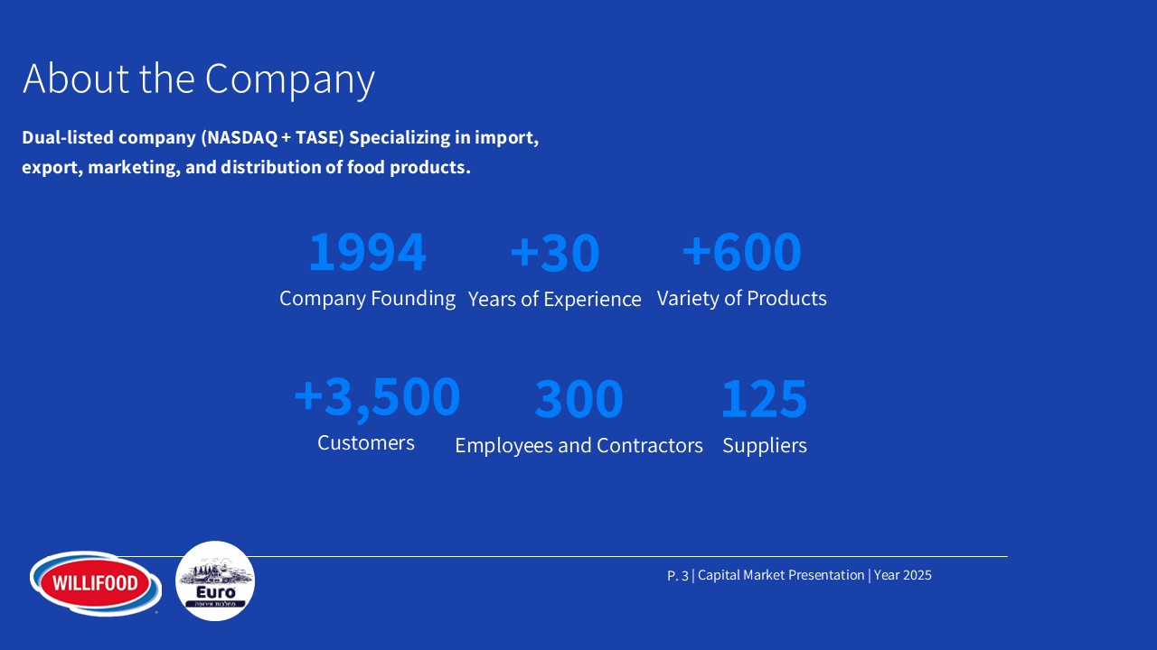 About the Company  Dual-listed company (NASDAQ + TASE) Specializing in import, export, marketing, and distribution of food products.  1994   Company Founding  30+  Years of Experience  600+  Variety of Products  3,500+   Customers  300  Employees and Contractors  125  Suppliers  | Capital Market Presentation | Year 2025      P. 3