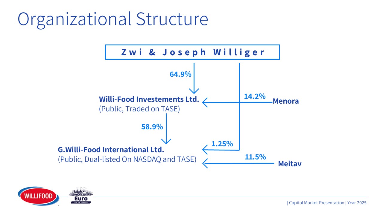 Organizational Structure  64.9%   Willi-Food Investements Ltd.  (Public, Traded on TASE)  58.9%   G.Willi-Food International Ltd.  (Public, Dual-listed On NASDAQ and TASE)  1.25%  Menora  14.2%   Zwi & Joseph Williger  Meitav  11.5%    Year 2025| Capital Market Presentation |