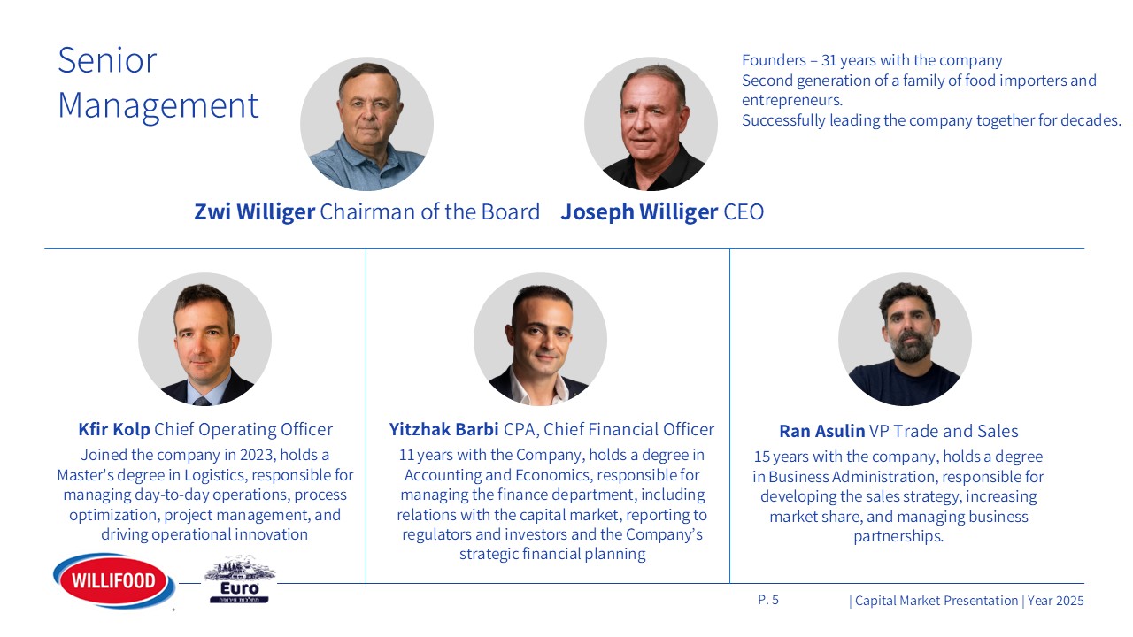 Year 2025| Capital Market Presentation |  P. 5   Senior  Management  Zwi Williger Chairman of the Board  Joseph Williger CEO  Founders – 31 years with the company Second generation of a family of food importers and entrepreneurs.Successfully leading the company together for decades.  Kfir Kolp Chief Operating Officer  Joined the company in 2023, holds a Master's degree in Logistics, responsible for managing day-to-day operations, process optimization, project management, and driving operational innovation  Yitzhak Barbi CPA, Chief Financial Officer  11 years with the Company, holds a degree in Accounting and Economics, responsible for managing the finance department, including relations with the capital market, reporting to regulators and investors and the Company’s strategic financial planning  Ran Asulin VP Trade and Sales  15 years with the company, holds a degree in Business Administration, responsible for developing the sales strategy, increasing market share, and managing business partnerships.