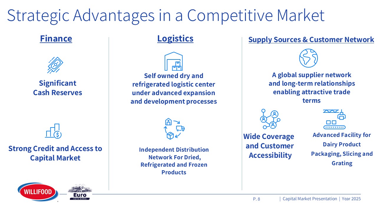 P. 8  Strategic Advantages in a Competitive Market  Self owned dry and refrigerated logistic center under advanced expansion and development processes  A global supplier network and long-term relationships enabling attractive trade terms  Independent Distribution   Network For Dried, Refrigerated and Frozen Products  Wide Coverage   and Customer   Accessibility  Logistics  Supply Sources & Customer Network  Advanced Facility for Dairy Product Packaging, Slicing and Grating  Strong Credit and Access to Capital Market  Significant Cash Reserves  Finance  Year 2025 | Capital Market Presentation |