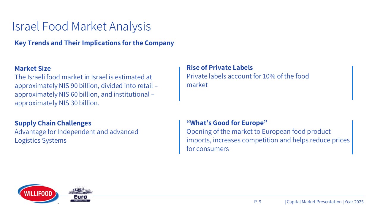 Year 2025 | Capital Market Presentation |   P. 9  Israel Food Market Analysis  Key Trends and Their Implications for the Company  Market Size  The Israeli food market in Israel is estimated at approximately NIS 90 billion, divided into retail – approximately NIS 60 billion, and institutional – approximately NIS 30 billion.  Supply Chain Challenges  Advantage for Independent and advanced Logistics Systems  Rise of Private Labels  Private labels account for 10% of the food market  “What’s Good for Europe”  Opening of the market to European food product imports, increases competition and helps reduce prices for consumers