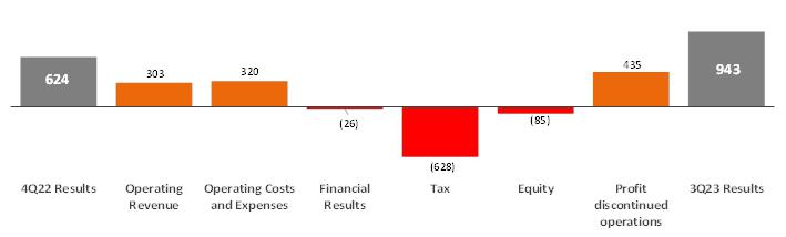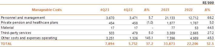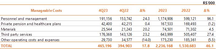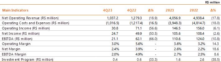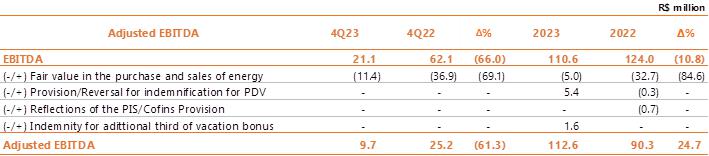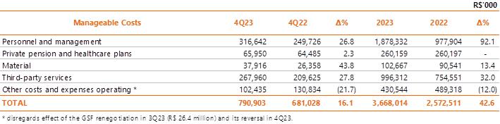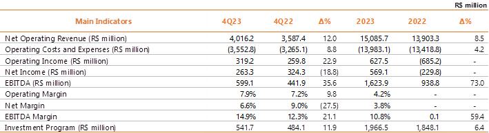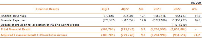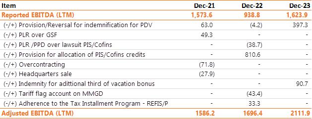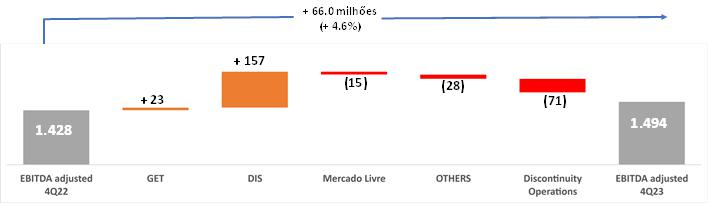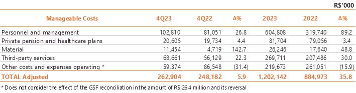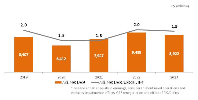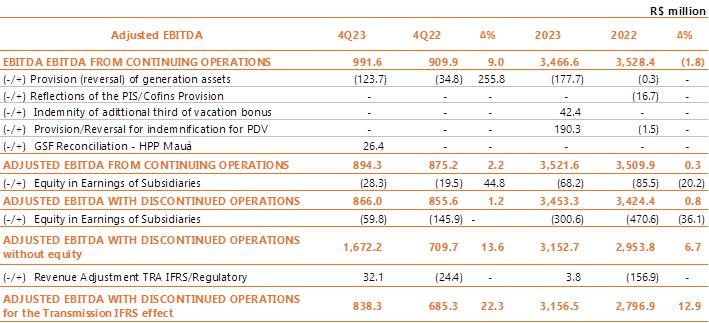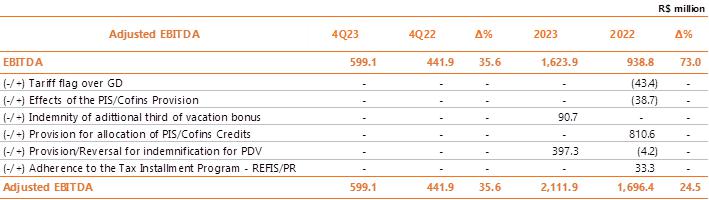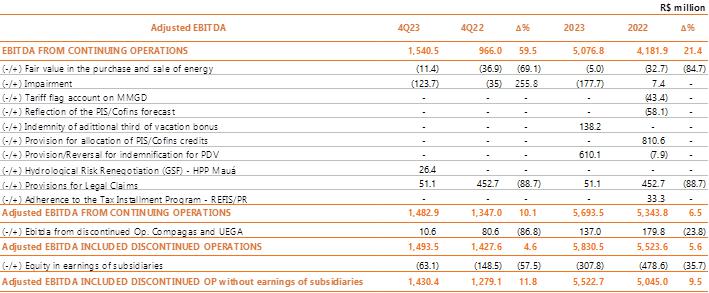 Adjusted EBITDA from continuing operations (excluding Compagas and UEGA, which are in the process of being sold) and excluding non-recurring items, grew 10.1% in 4Q23 (R$1,482.9 compared to R$1,347.0 million in 4Q22 ) reflecting, above all, the better result of Copel Distribuição (+35.6%). When including the result of discontinued operations, adjusted EBITDA reached R$1,493.6 million, an amount 4.6% higher than the R$1,427.6 million recorded in 4Q22 and, also, when excluding the effects of the equity in earnings of subsidiaries (that is, adjusted EBITDA with all operations and without equity in earnings of subsidiaries) there was an increase of 11.8% (R$1,430.5 million in 4Q23 compared to R$1,279.2 million in 4Q22).