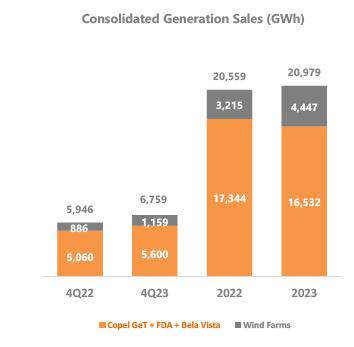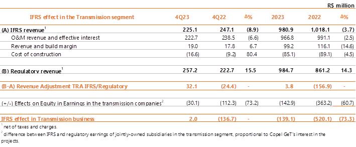 These events were partially offset, above all, by (i) lower remuneration on transmission agreement assets, mainly due to the periodic tariff review applied to the agreements and lower inflation in the comparison between periods (IPCA of 1.08% in 4Q23 compared to 1.63% in 4Q22), with a reduction of R$15.9 million in Copel GeT's revenue from use of the main transmission grid and R$85.3 million in equity in earnings of subsidiaries; and (ii) the reduction of R$30.2 million in revenue from wind farms[2] due to generation diversion in the comparison between periods, essentially due to the operational restriction imposed by the ONS (Constrained-off).