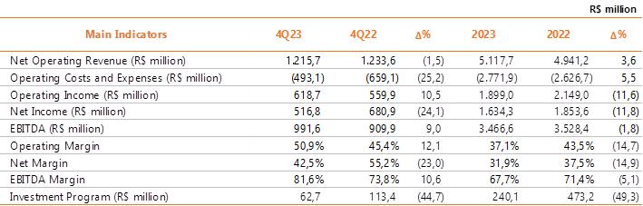 ³ Contract renewed according to Law 12,783/13. The O&M portion is part of the RBSE, under the terms of the Law. It will be received until the end of the concession (Jan/2043). The value of the APR for the 2023-2024 cycle, excluding the RBSE, according to REH 3,216/2023, is R$ 146.1 million. This amount refers to additional RAP for reinforcements and improvements, in effect when REH 3,216/2023 was published.