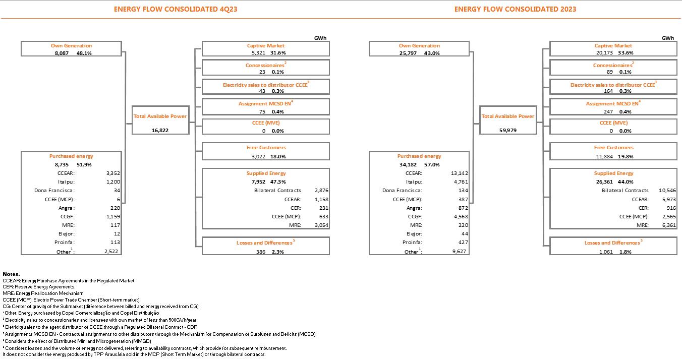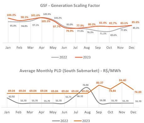 Therefore, the main factors that explain the growth in results in the quarter are, mainly, (i) the 8.0% growth in the billed grid market, (ii) the tariff adjustment in June 2023, with an average effect of 6.32% in Tariffs for the Use of the Distribution System (TUSD), and (iii) the increase of 5.4% (+R$8.1 million) in other operating revenues, mainly because of leases and rentals of equipment and structures and sharing of posts. Also contributing to the result were: (i) Copel GeT's better performance in the purchase and sale of electricity (+R$50.9 million 4Q23 compared to 4Q22), due to the scenario of greater hydrology in 4Q23 (average GSF of 83.8%, compared to 77.6% in 4Q22) and the increase in results from the Aventura and Santa Rosa & Mundo Novo – SRMN Wind Complexes, acquired on January 30, 2023 (+ R$29.1 million in adjusted EBITDA); and (ii) the reversal of provisions in 4Q23 mainly due to the reversal of R$83.0 million in regulatory litigation within the scope of Copel GeT, effect of Aneel Order No. 4,758 of December 5, 2023 which deals with the calculation methodology of the Surplus and Deficit Compensation Mechanism (MCSD)[1].
