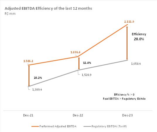 This achievement goes beyond the renewal of these fundamental concessions. As a corporation, with a private legal nature, Copel gains better conditions to operate in the competitive and challenging environment of the electricity sector, with efficiency gains and the real possibility of leveraging investment conditions. We combine Copel's 69-year history of contributions to the national electricity sector with a more competitive, sustainable and innovative future, contributing to the development of Paraná and Brazil. The success of the transformation process into a corporation was aligned with the company's other operations. We achieved an adjusted EBITDA of R$5.8 billion and a net income of R$2.3 billion, an increase of 102% compared to the previous year. In 2023, we made the largest investment in the history of Copel Distribuição with an investment of R$2 billion for the modernization, expansion and automation of Paraná's electrical infrastructure. Thus, at the end of the year we achieved historic efficiency, with adjusted EBITDA exceeding regulatory EBITDA by 28%.