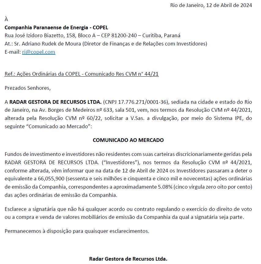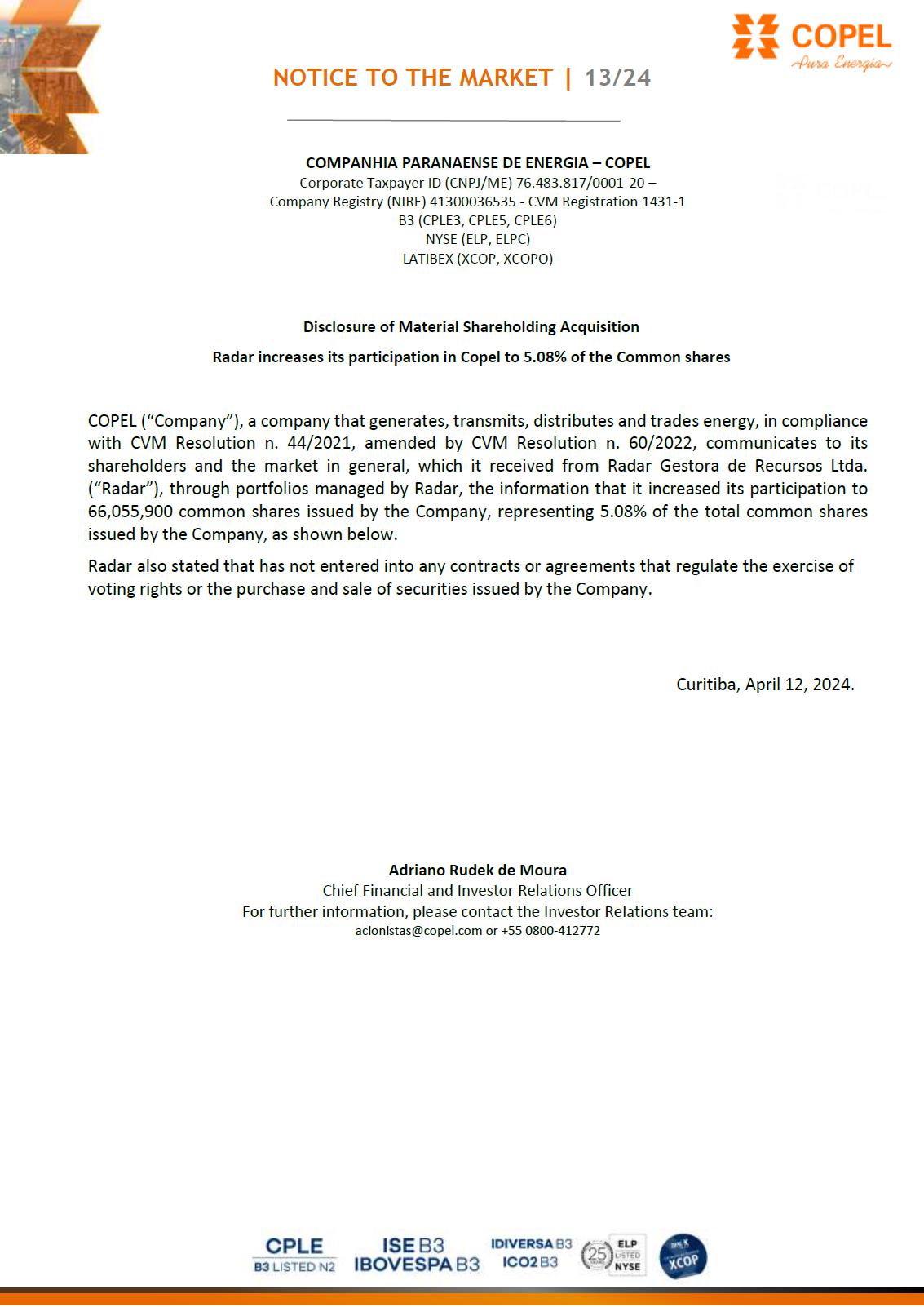 COMPANHIA PARANAENSE DE ENERGIA – COPEL