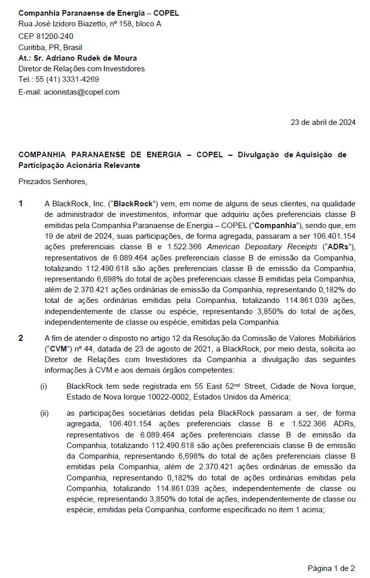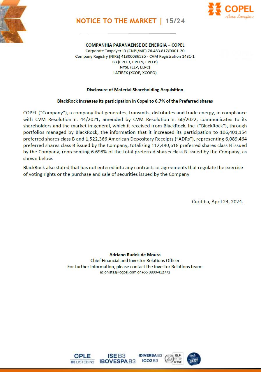 COMPANHIA PARANAENSE DE ENERGIA – COPEL