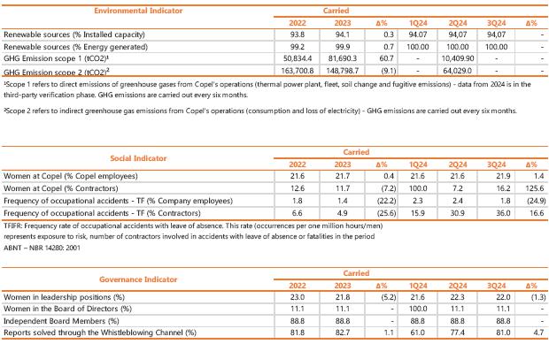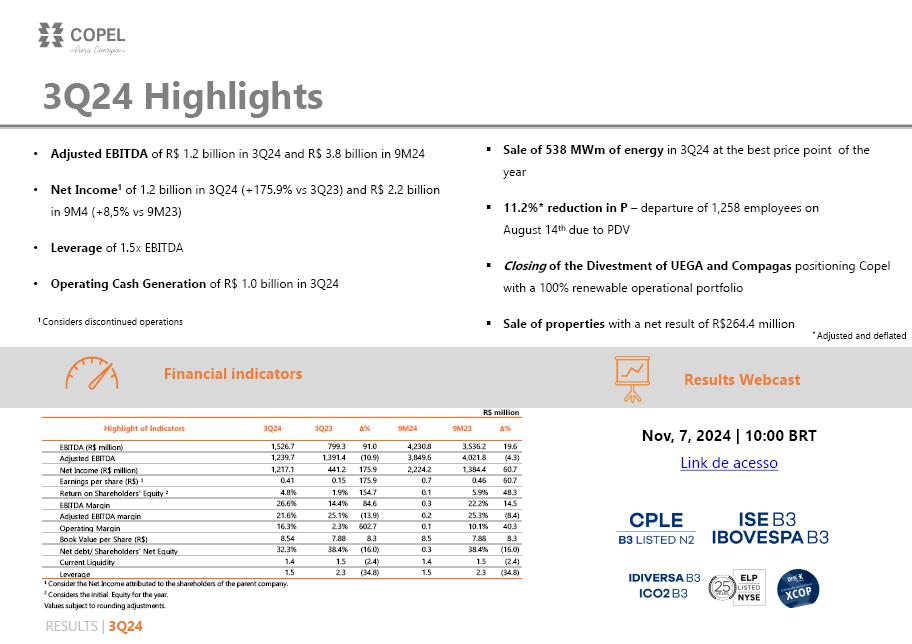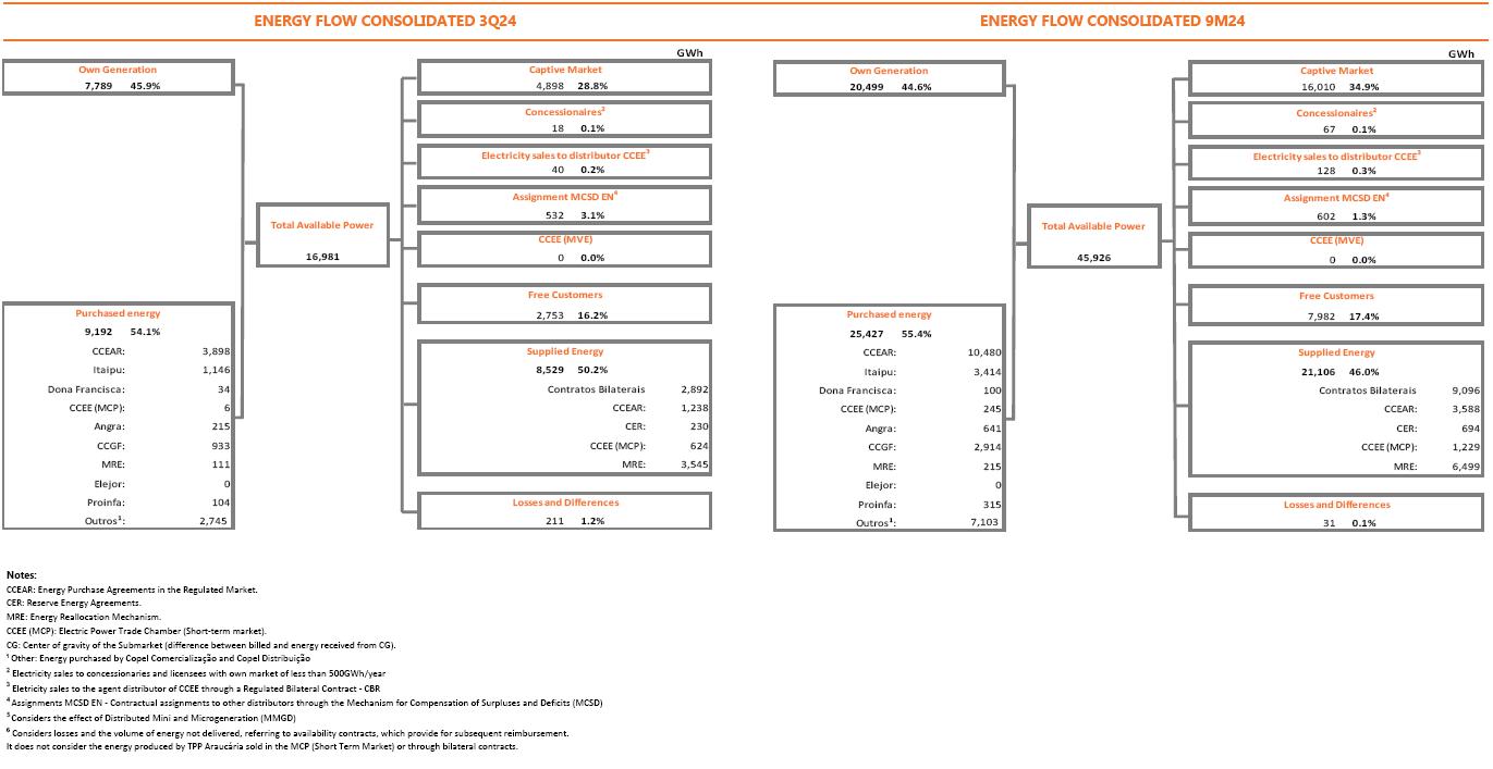 Of particular note in this quarter was (i) the 8.7% increase in Copel Distribuição's EBITDA compared to 3Q23, reaching R$607 million, as a result of the 4.4% growth in the billed grid market and the average 2.7% increase in Distribution System Use Tariffs (TUSD); and (ii) the 11.2% reduction (or R$26.0 million) in personnel and management costs when the inflationary effect between the periods is isolated, mostly explained by the departure of 1,258 employees from the Company in the Voluntary Dismissal Program (PDV) in August of this year.
