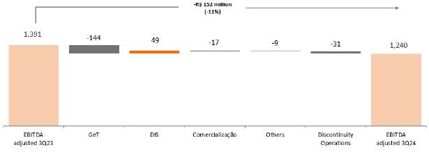 Copel's adjusted EBITDA[1] was R$1,239.7 million in 3Q24, reflecting the strength of an integrated company with a diversified portfolio, scenario in which Copel Geração e Transmissão (Copel GeT) and Copel Comercialização (Copel COM) accounted for approximately 51.8% of this result, while Copel Distribuição (Copel DIS) accounted for 48.2%.