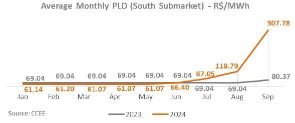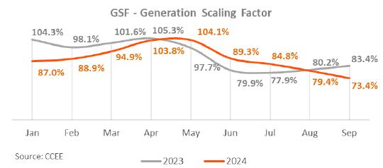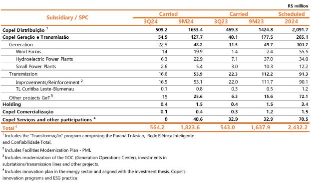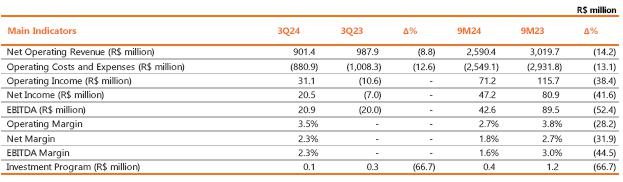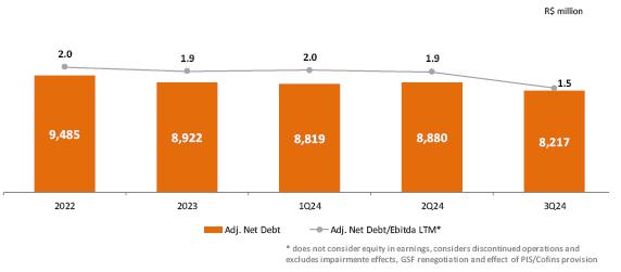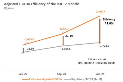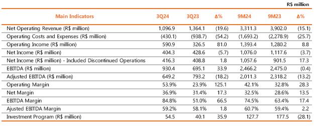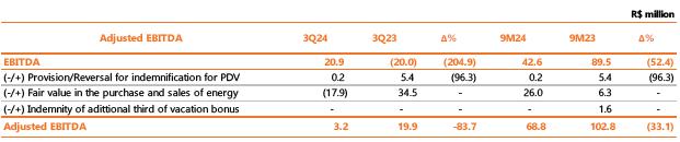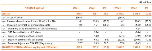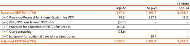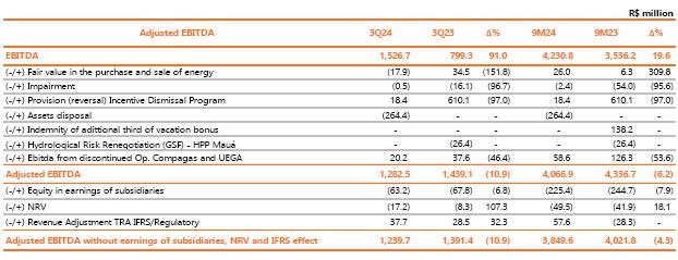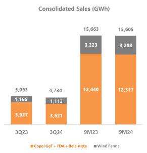 Considering the period to September 2024, adjusted EBITDA reached R$ 3,849.6 million, 4.3% lower than the R$ 4,021.8 million recorded in the same period of 2023, mainly justified by the lower average price of energy sold and the deviation of generation from wind complexes given the higher curtailment in 2024; partially offset by the 21.7% growth in Copel DIS.