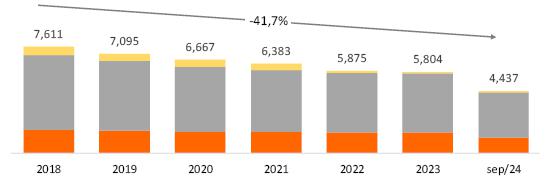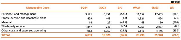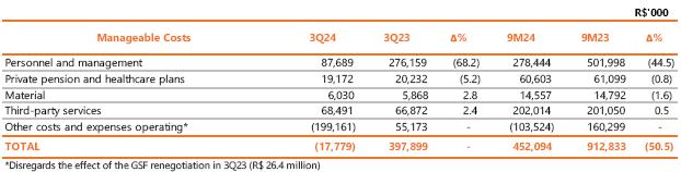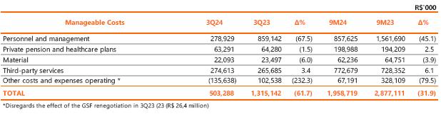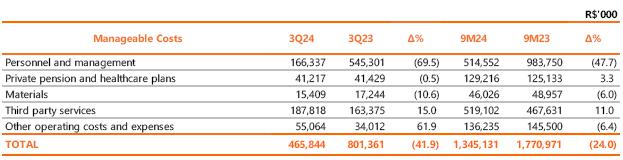 In 3Q24, operating costs and expenses totaled R$4,640.5 million, down 10.1% compared to the R$5,160.3 million recorded in 3Q23. The variation is mainly due to the reduction of R$811.9 million with PMSO (manageable costs), excluding provisions and reversals, mainly due to the recording in 3Q23 of R$610.1 million related to the Voluntary Dismissal Program (PDV) and the recognition, in 3Q24, of the result of the sale of assets unserviceable to Copel GeT's concession, in the amount of R$264.4 million, in other operating costs and expenses (more details in Other Highlights).