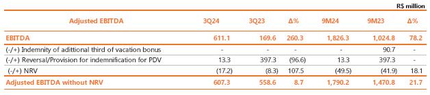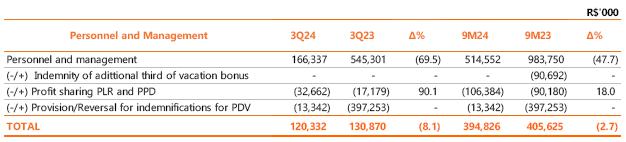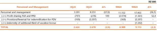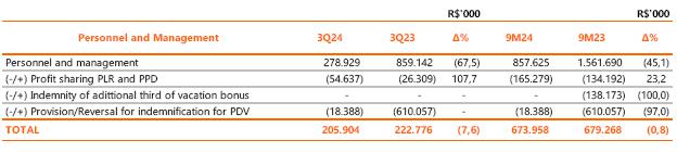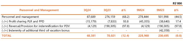 Neutralizing the effects of provisions related to performance bonuses (PPD), profit sharing (PLR), long-term incentives and PDV, there was a reduction of 7.6% (R$ 16,9 million) in personnel and management costs in the quarterly comparison, an effect of the reduction of 1,393 employees in the comparison between the periods, partially offset by the salary adjustment of 4.51% in the Collective Agreement of October 2023. Isolating the effects of the accumulated inflation of 4.09% measured by the INPC (the National Consumer Price Index), there is a decrease of 11.2% (or R$ 26.0 million) in personnel compared to 3Q23.