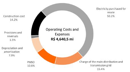 In 2024, total operating costs and expenses reached R$13,715.7 million, 0.5% higher than the R$13,647.5 million recorded in the same period of 2023. The main variations were: (i) an increase of R$620.3 million in electricity purchased for resale, mainly due to the 53.9% increase (+R$420.6 million) in financial compensation for energy from distributed generation systems; (ii) an increase of R$103.9 million in network usage charges due to the readjustment of network usage contracts and an increase in energy consumption; and (iii) an increase of R$44.3 million in third-party services, as a result of higher amounts for maintenance of the electricity system and maintenance of facilities.