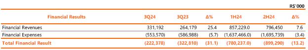The financial result improved by R$100.4 million (negative R$222.4 million, compared to negative R$322.8 million recorded in 3Q23), mainly due to: (i) income from financial investments with an increase of R$37.7 million (+22.4%), due to higher fund-raising, higher interest rates, higher cash from operating activities and the availability of the amount raised in the Primary Share Offering; (ii) expenditure on monetary variation of debt charges which fell by R$23.8 million (-5.3%); (iii) interest on taxes to be offset with an increase of R$22.8 million (+131.1%) and (iv) the late payment surcharge on invoices with an increase of R$19.2 million (+43.9%) due mainly to the recovery of invoices due to the reduction in delinquency at Copel Distribuição. The improvement in results was partially offset by (v) the increase in financial expenses with monetary restatement of provisions for litigation (R$39.6 million in 3Q24 compared to R$18.5 million in 3Q23).
