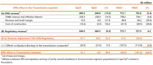 The equity result of Copel's jointly-controlled ventures and other affiliates in 3Q24 was 6.8% lower than in the same period of the previous year (R$63.2 million, compared to R$67.8 million in 3Q23). This result is mainly due to the effect of the Mata de Santa Genebra tariff review. Details of the results can be seen in Annex I.