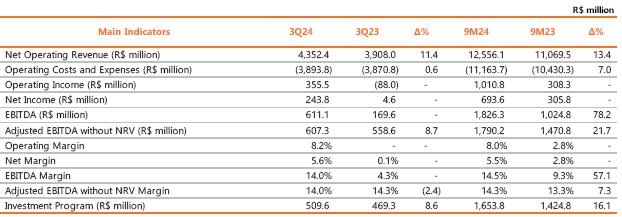 Net operating revenue totaled R$5,735.6 million in 3Q24, up 3.5% on the R$5,544.0 million recorded in 3Q23. This result mainly reflects the increase in: