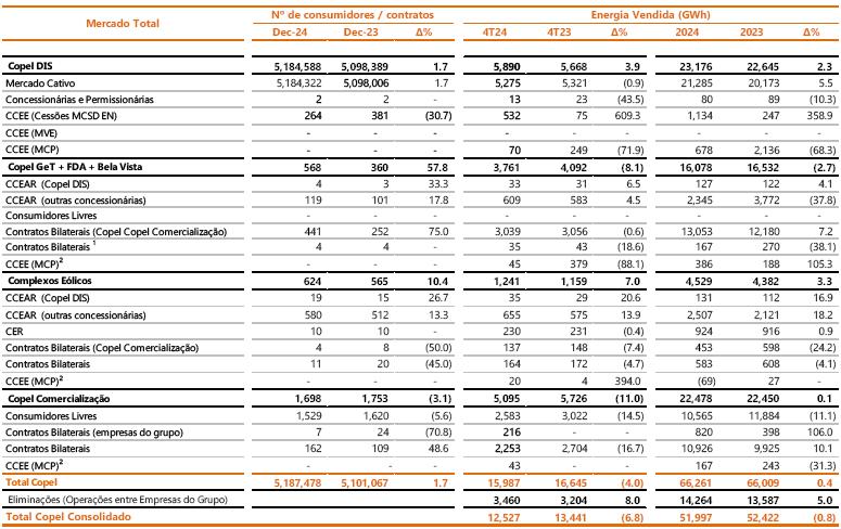 The following table shows Copel's total energy sales, segmented between Copel Distribuição, Copel Geração e Transmissão, Wind Farms and Copel Comercialização: