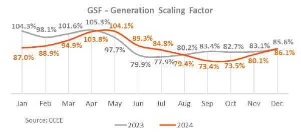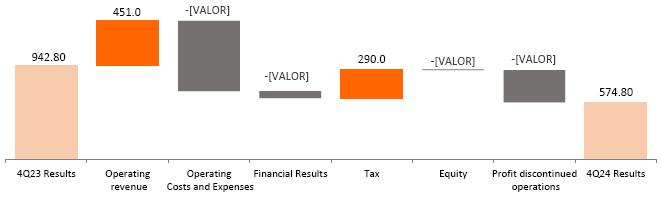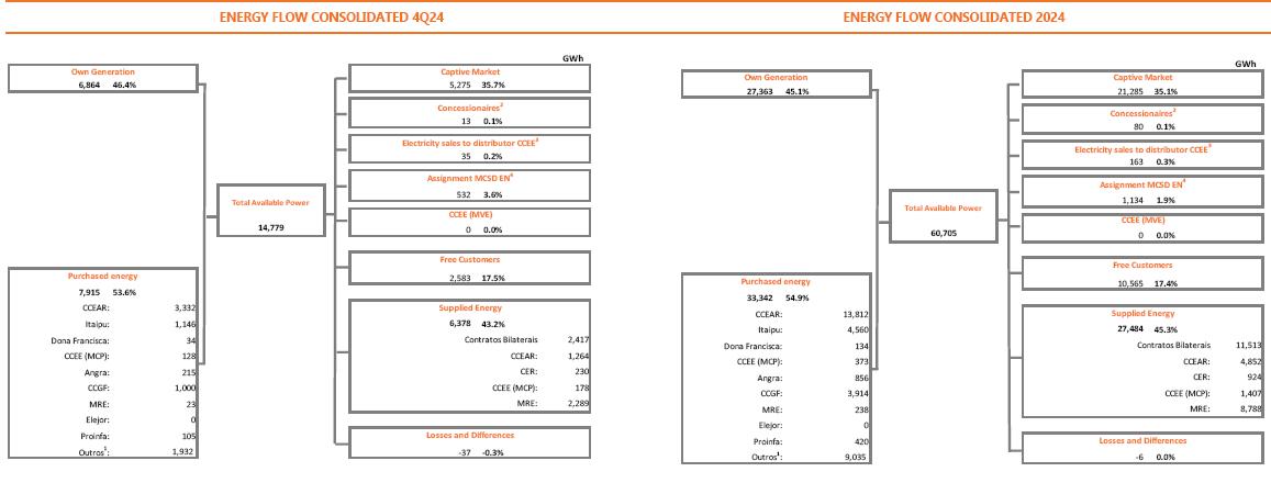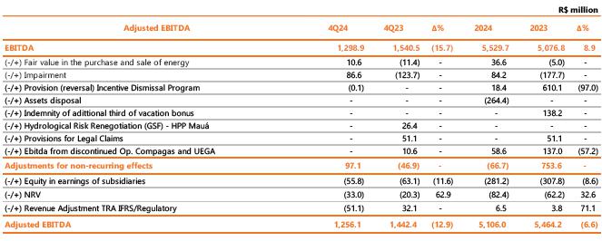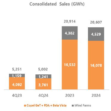 In the year-on-year comparison, consolidated EBITDA in 4Q24 was 12.9% lower than the R$ 1,442.4 million in 4Q23, mainly reflecting the following: (i) the lower average price of energy sold in Copel GeT's portfolio (R$ 178.72 compared to R$ 206.63 in 2023, a reduction of 13.5%); (ii) the generation deviation of R$ 93.4 million (+49%), caused by the lower performance of the wind complexes, essentially, by the volume of wind below the certification, curtailment of 13.1% in 4Q24 (compared to 8.3% in 4Q23) and unavailability of the generation complex due to maintenance and installations; (iii) the higher volume from the distributed micro and minigeneration compensation system (MMGD) of R$ 180.1 million and (iv) the increase in litigation provisions in the amount of R$63.6 million, especially in civil lawsuits.