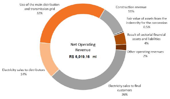 In 2024, net operating revenue totaled R$22,651.0 million, an increase of 5.5% compared to the R$21,479.5 million recorded in 2023, with emphasis on the following variations: (i) an increase of R$1,045.8 million (+17.4%) in revenue from electricity network availability, mainly due to periodic tariff adjustments in June 2023 and June 2024, as well as the 5.2% increase in the billed wire market, partially offset by the impacts of the tariff review of Copel GeT's transmission concession contracts; (ii) an increase of R$508.8 million (+6.4%) in electricity supply, especially due to periodic tariff adjustments of 17.4% in June 2023 and a reduction of 4.0% as of June 2024 and the increase in the captive market billed by 5.5%; (iii) an increase of R$217.0 million (+9.3%) in construction revenue due to the volume of works under the Copel Dis investment program; partially offset by (iv) a decrease of R$482.2 million (-13.4%) in revenue from electricity supply given the termination of the CCEAR contract for the Salto Caxias HPP with supply from May to September 2023 at a price of R$252.99/MWh and the increase in the generation deviation, caused by the lower performance of the wind complexes, as previously mentioned; and (v) reduction of R$132.9 million (-13.7%) in the item result of sectoral financial assets and liabilities, mainly due to the growth of the billed market and the better adherence of tariff coverage in relation to the realized costs of Parcel A (non-manageable costs).