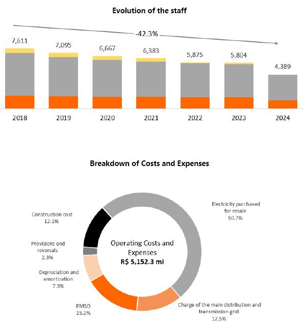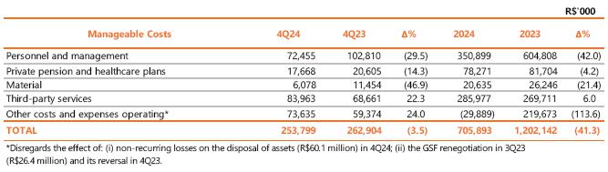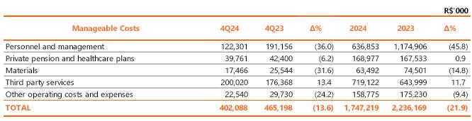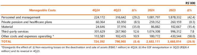In 4Q24, operating costs and expenses totaled R$5,152.3 million, an increase of 15.9% compared to the R$ 4,445.1 million recorded in 4Q23. The following stand out: