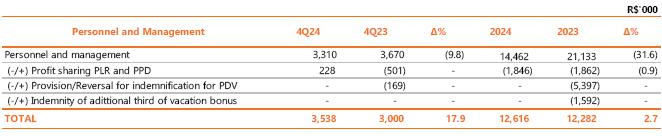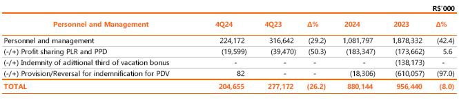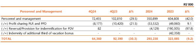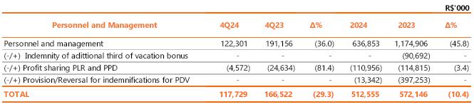 Neutralizing the effects of provisions related to performance premiums (PPD), profit sharing (PLR), long-term incentives and PDV, there was a reduction of R$72.5 million (-26.2%) in personnel and management costs in the quarterly comparison, an effect of the reduction of 1,415 in the total number of employees in the comparison between the periods, partially offset by the pro rata provision between October and December of the collective bargaining agreement - ACT 2024, with a salary adjustment of the National Consumer Price Index - INPC, of 4.09% considering 12 months until September/2024.