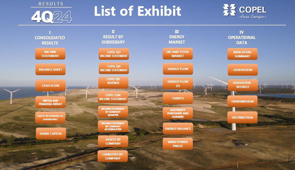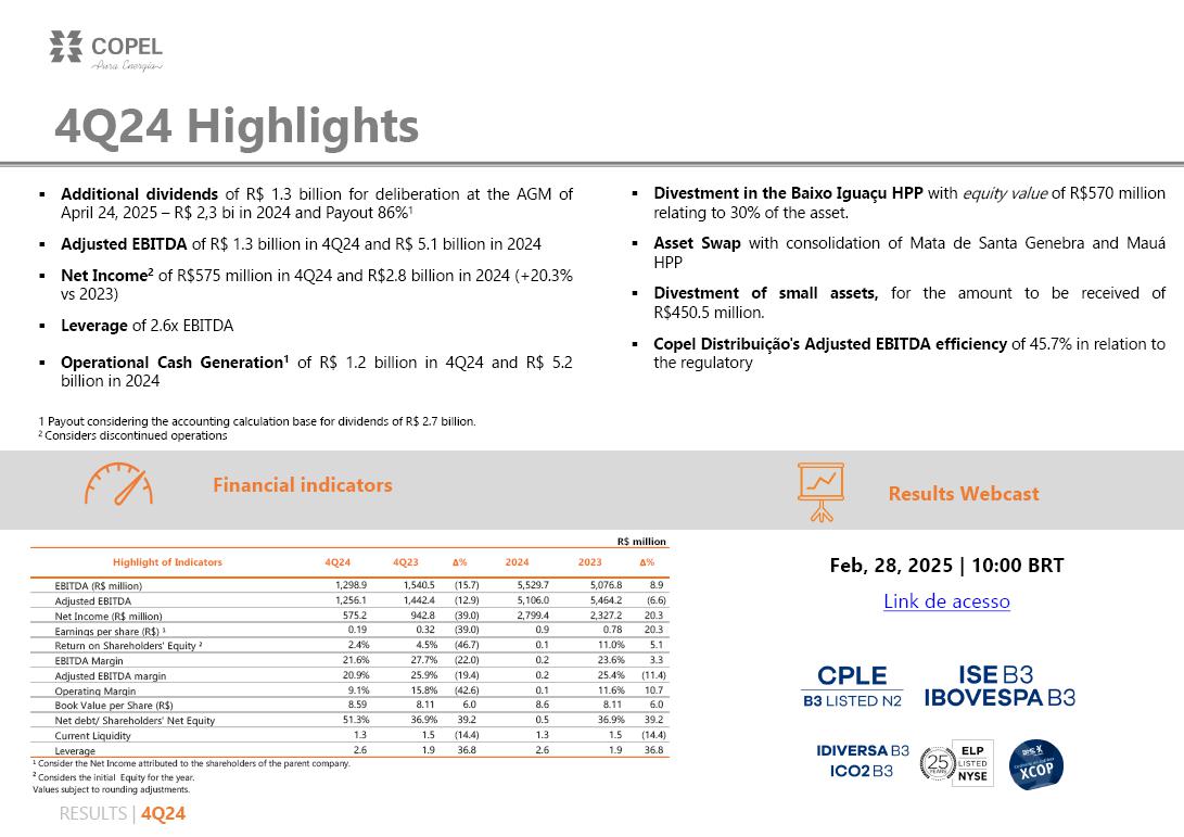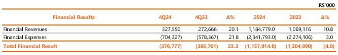 The financial result was negative R$376.8 million in 4Q24 compared to negative R$305.7 million recorded in 4Q23, an increase of R$71.1 million, mainly reflecting the following (i) the increase in expenses with monetary variation, exchange rate and debt charges by R$84.8 million (+20.7%) due to the increase in debt and CDI (Copel's main debt index; (ii) the increase in PIS/Pasep and Cofins on interest on equity of R$28.3 million (+92.8%) due to the higher amount of JCP paid by subsidiaries to holding companies in 4Q23; (iii) the increase in monetary variation and adjustment to present value on accounts payable linked to the concession (UBP) in the amount of R$20.4 million (52.3%); and (iv) the increase in the exchange rate variation on the purchase of electricity from Itaipu in the amount of R$ 20.6 million due to the appreciation of the dollar.