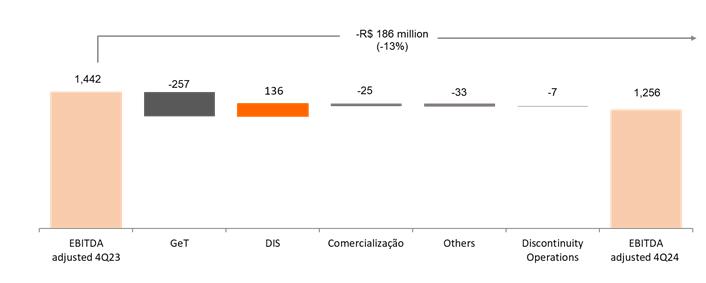 Copel's adjusted EBITDA[1] was R$1,256.1 million in 4Q24, reflecting another quarter of consistency in deliveries and discipline in capital allocation. Copel Geração e Transmissão (Copel GeT) and Copel Comercialização (Copel Com) accounted for approximately 47.6% of this result, while Copel Distribuição (Copel Dis) accounted for 56.9%.[2]