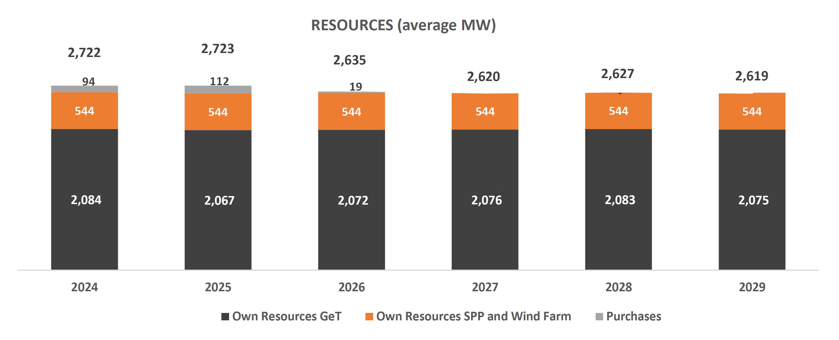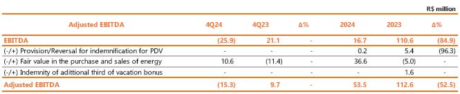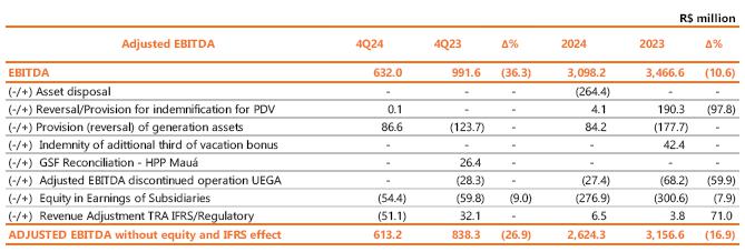 Year-to-date, adjusted EBITDA reached R$5,106.0 million, 6.6% lower than the R$5,464.2 million recorded in 2023, mainly justified by (i) the lower average price of energy sold in Copel GeT's portfolio; (ii) higher volume of energy from MMGD at R$ 600.7 million at Copel Dis; (iii) generation deviation of R$ 251.6 million, caused by the lower performance of the wind complexes, reflecting wind volume below certification, curtailment and unavailability of the generation complex resulting from maintenance and installations in 2024; (iv) partially offset by the resulting increase in revenue from the availability of the power grid of Copel Dis.
