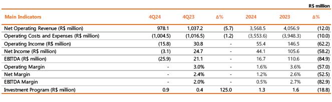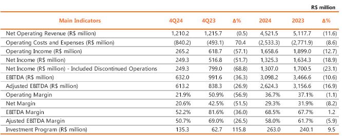 (v)reduction of R$ 18.8 million (-11.9%) in other operating revenues mainly due to the amount of R$ 29.8 million related to the sharing fine amounts issued to communication companies in 4Q23, which was not repeated in 4Q24 due to the regularization of the infrastructure.