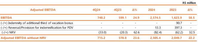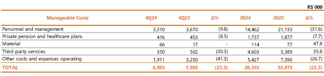 Isolating the effects of the accumulated inflation measured by the INPC of 4.77% (January to December 2024), there is a reduction of 29.5% (or R$ 85.7 million) in personnel compared to 4Q23.
