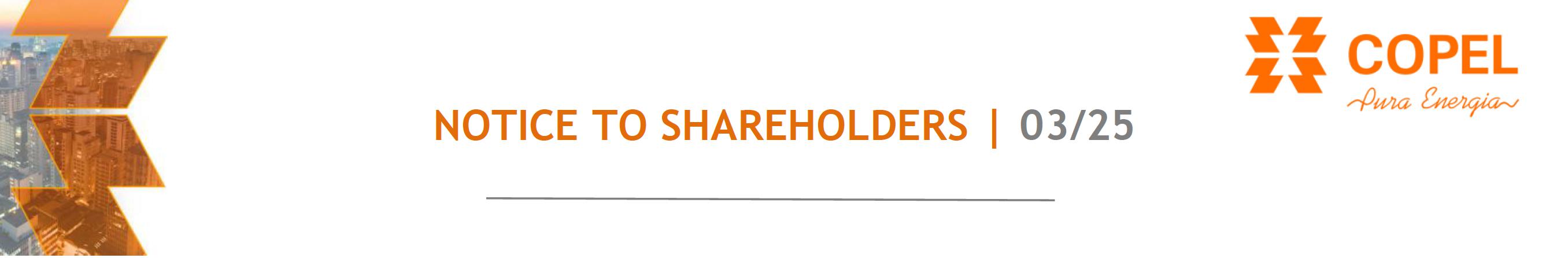 Companhia Paranaense de Energia - COPEL, hereby informs its shareholders that an adjustment has been made to the unit value per share of the dividends approved at the Annual General Meeting held on 24.04.2025, excluding treasury shares, resulting in an amount higher than that informed in Notice to Shareholders 02/25.